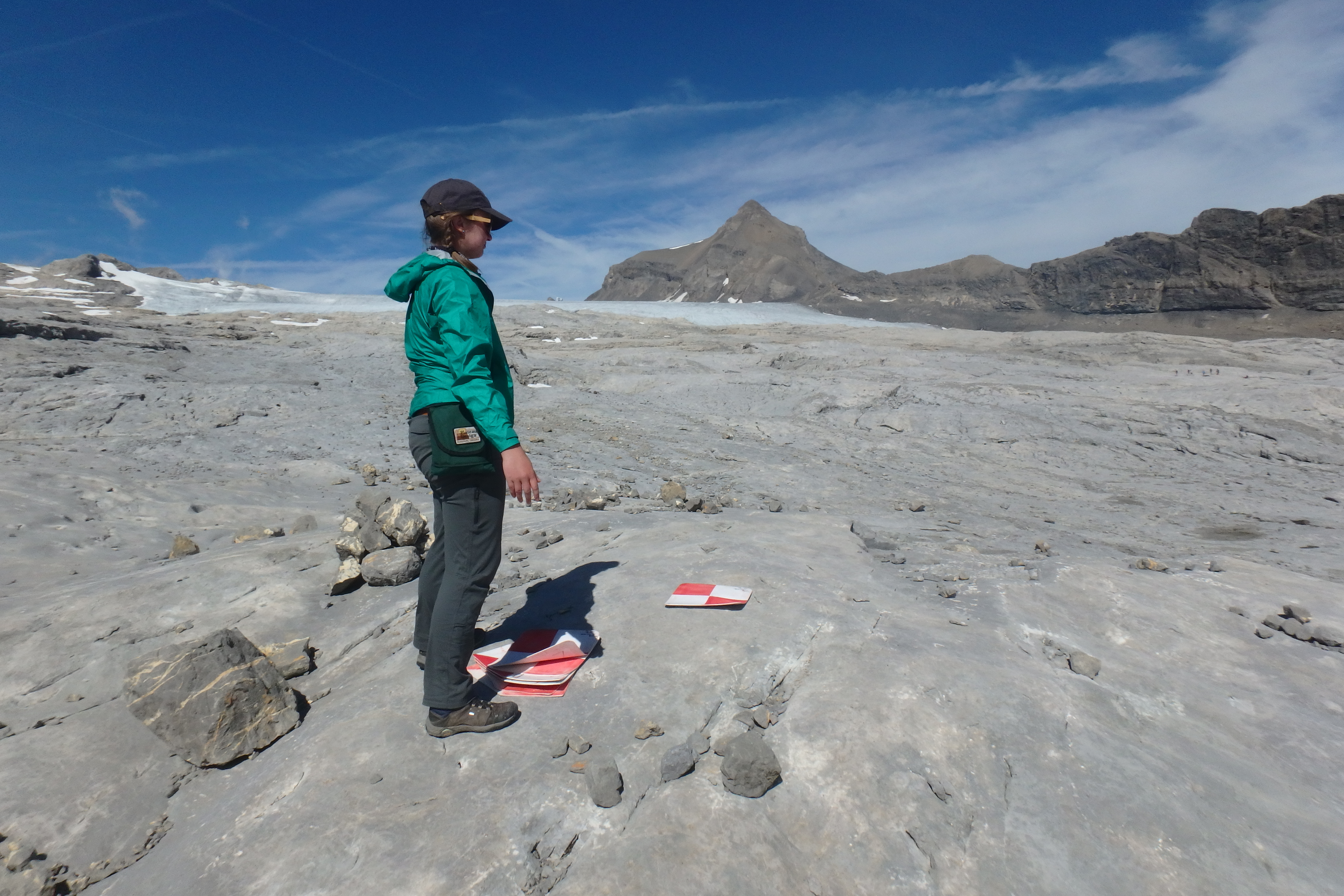 Graduate Student Anna Thompson uses the GPS to navigate the way to the waypoints to place the markers. Tsanfleuron Glacier, Switzerland.