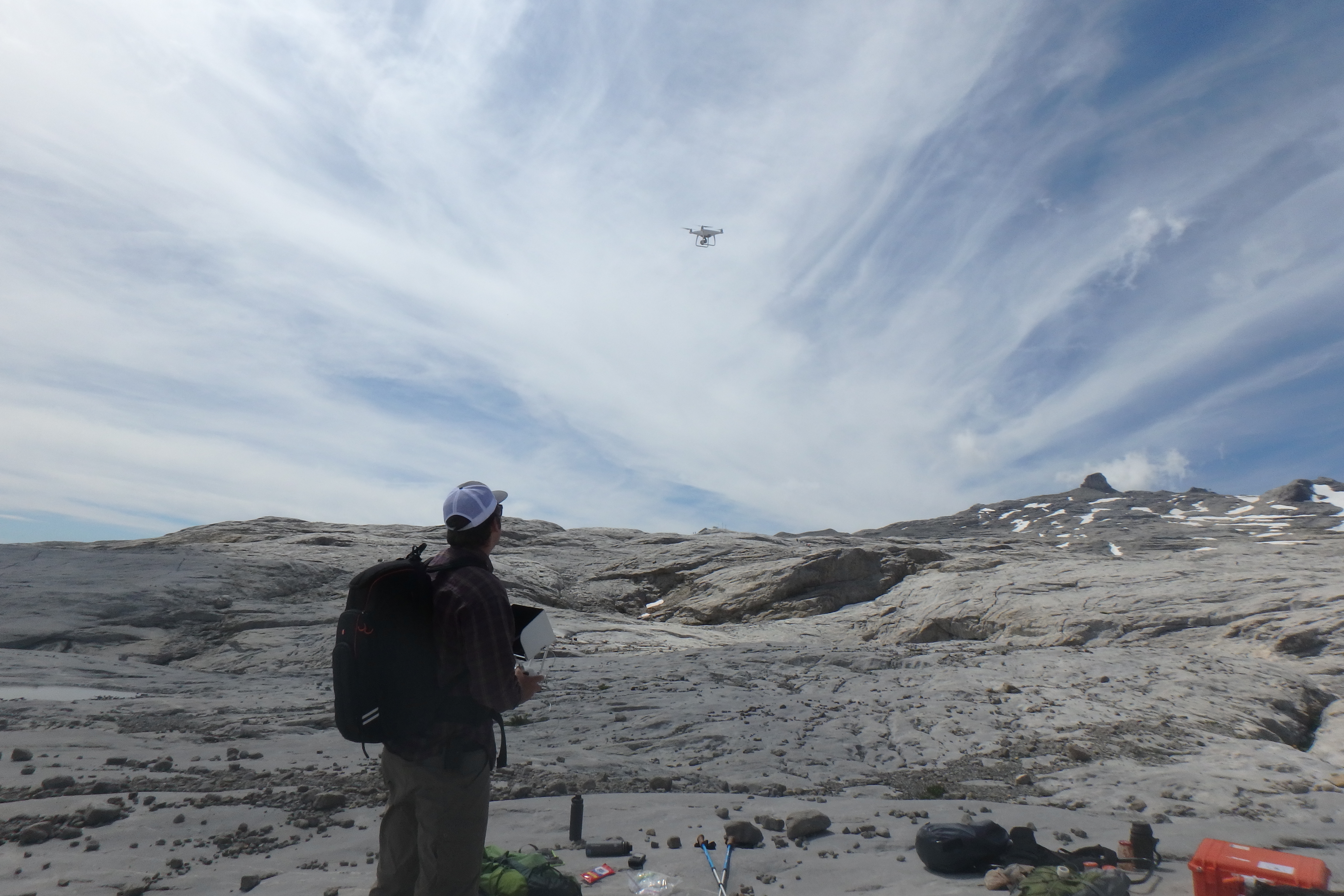 PhD student Jacob Woodard flies the drone at the Tsanflueron Glacier forefield. Tsanfleuron Glacier, Switzerland.