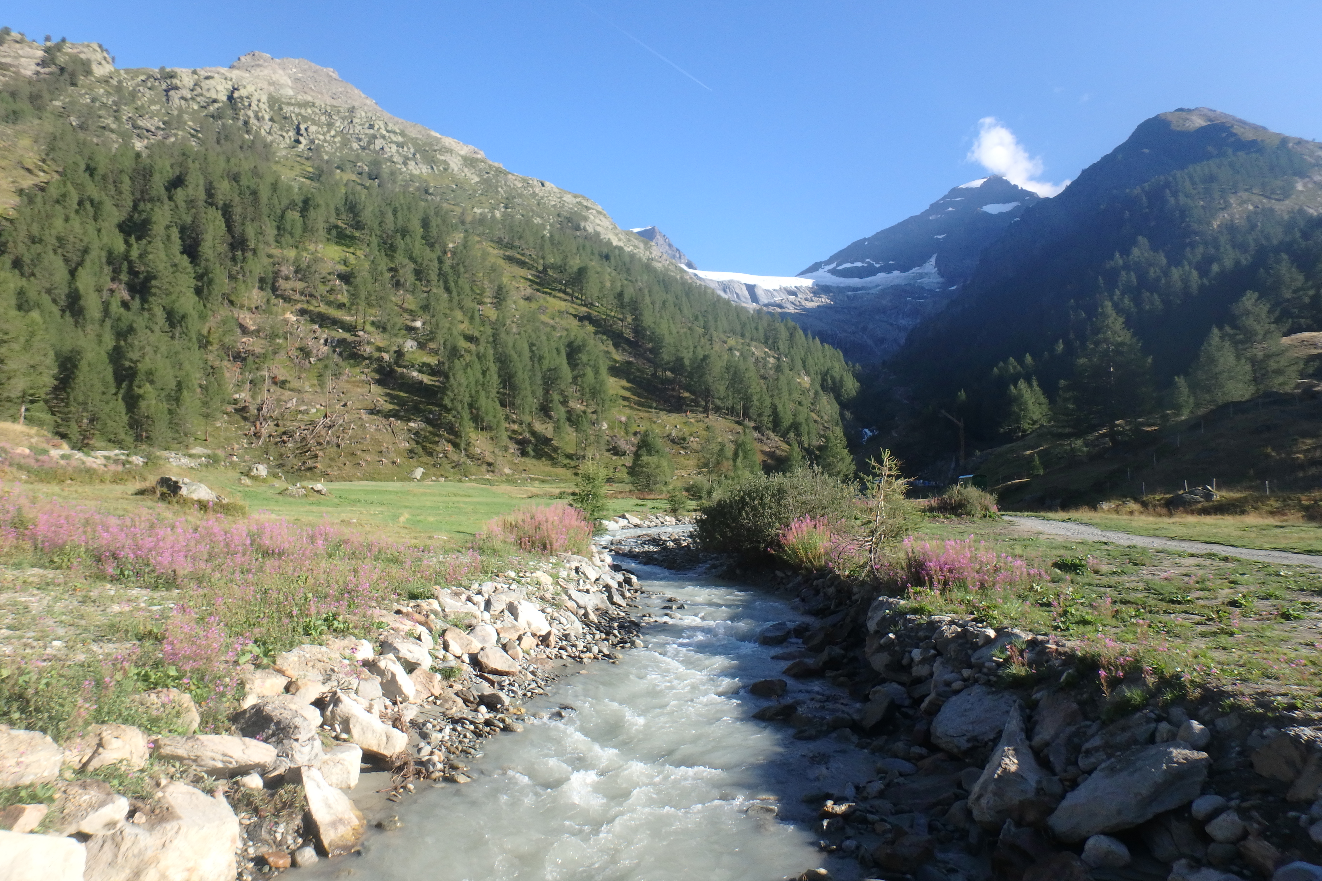 A view of a mountain stream and the glacier along the hiking trail to the Usser Tal forefield. Usser Tal Glacier, Switzerland.
