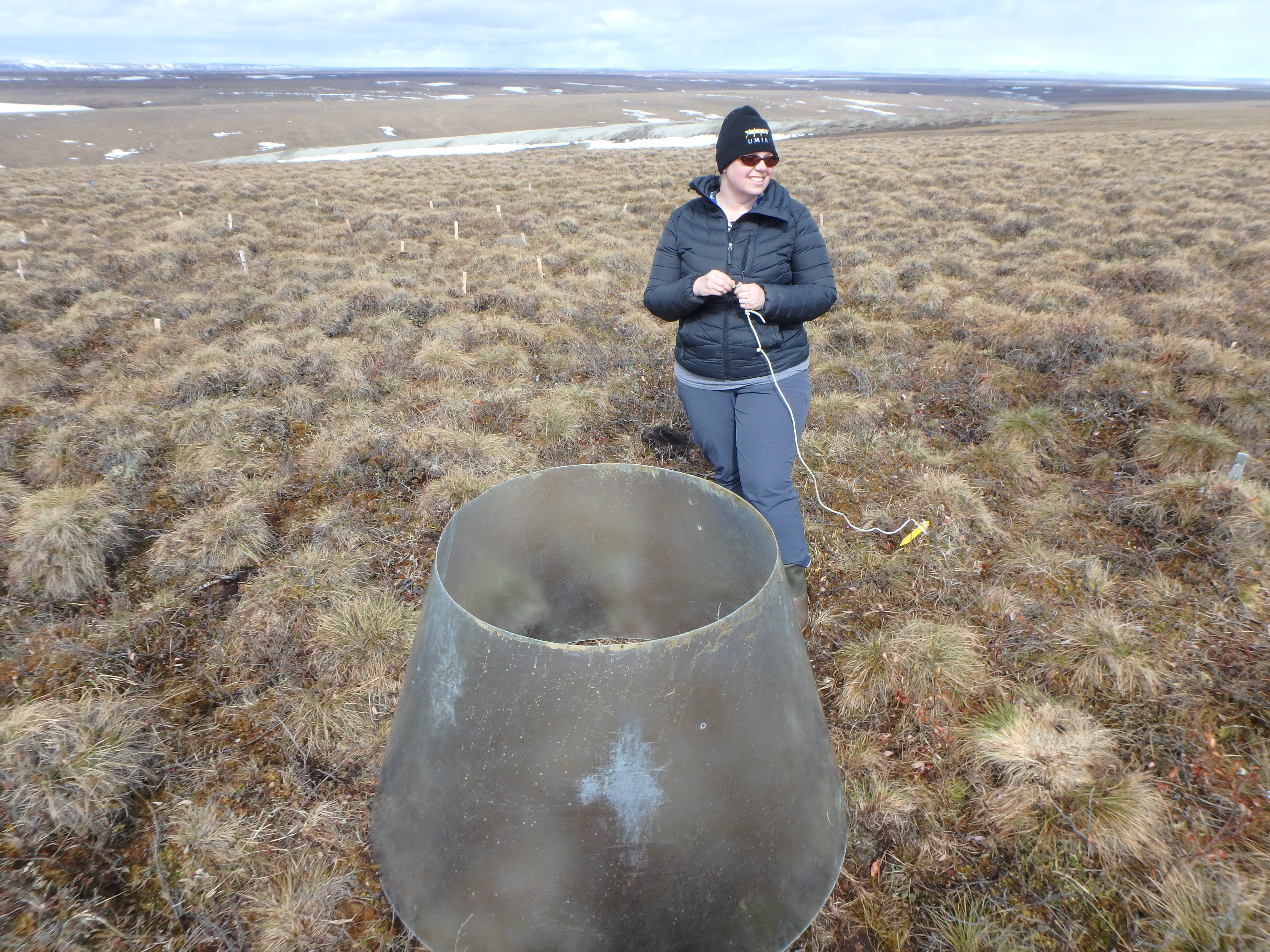 Melissa Lau places the OTC (open top chamber) over the experimental site and prepares to stake it down. Sagwon, Alaska.