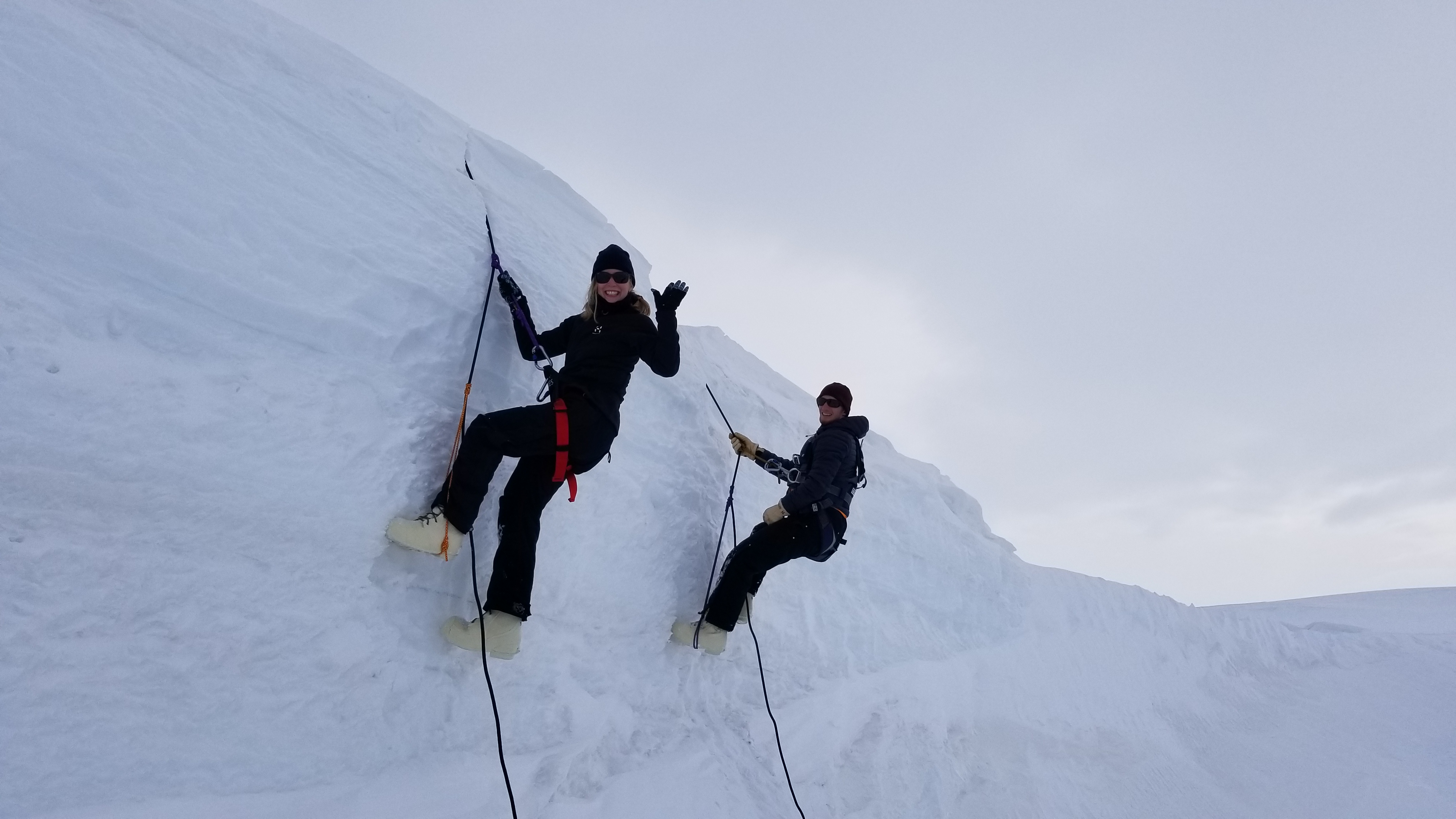 Antarctic Automatic Weather Station team members Elina Valkonen and Dave Mikolajczyk rappel into a crevasse for training. Near McMurdo Station, Antarctica.