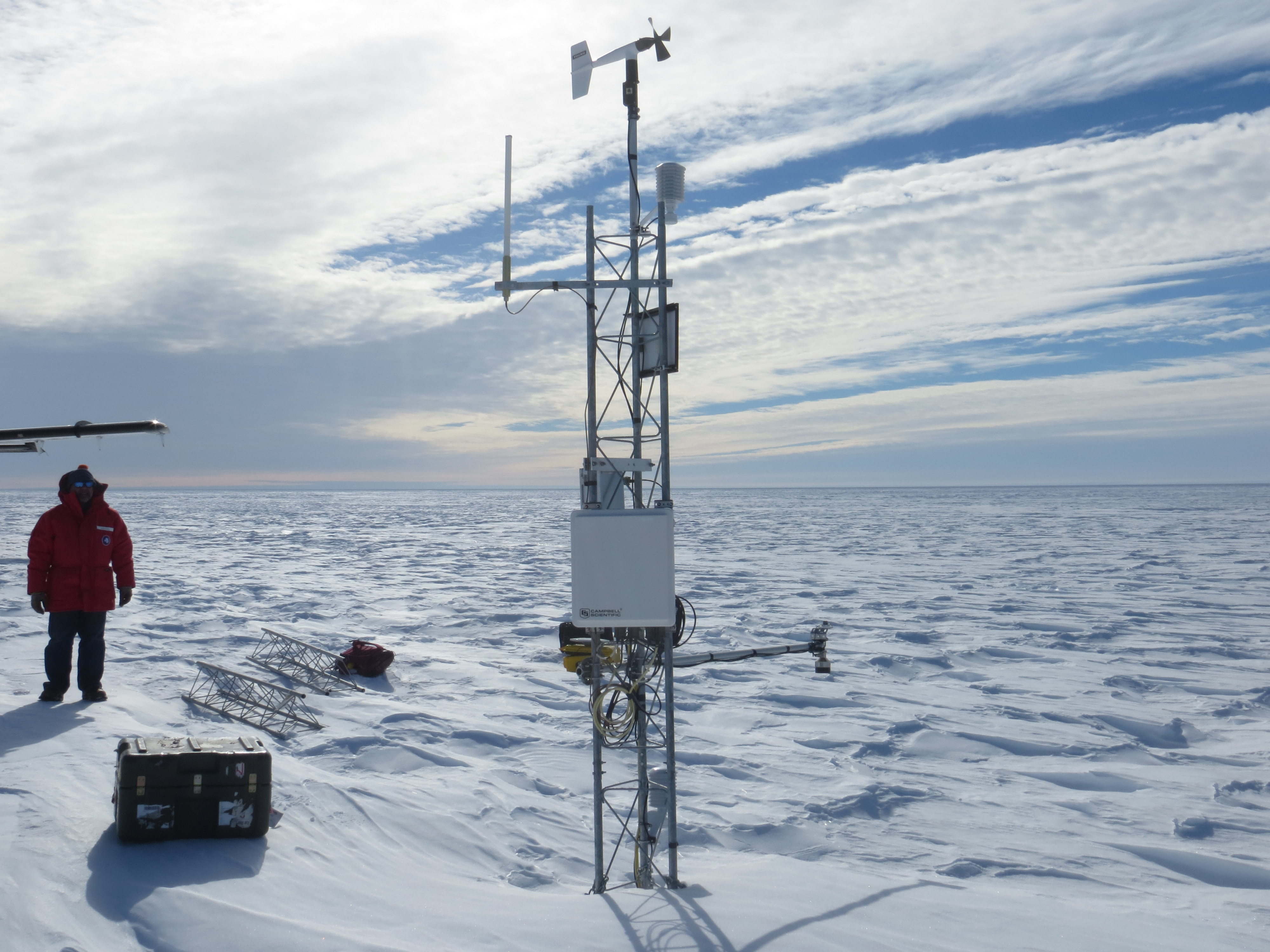 Mike Penn stands next to the Sabrina Automatic Weather Station (AWS), Antarctica.