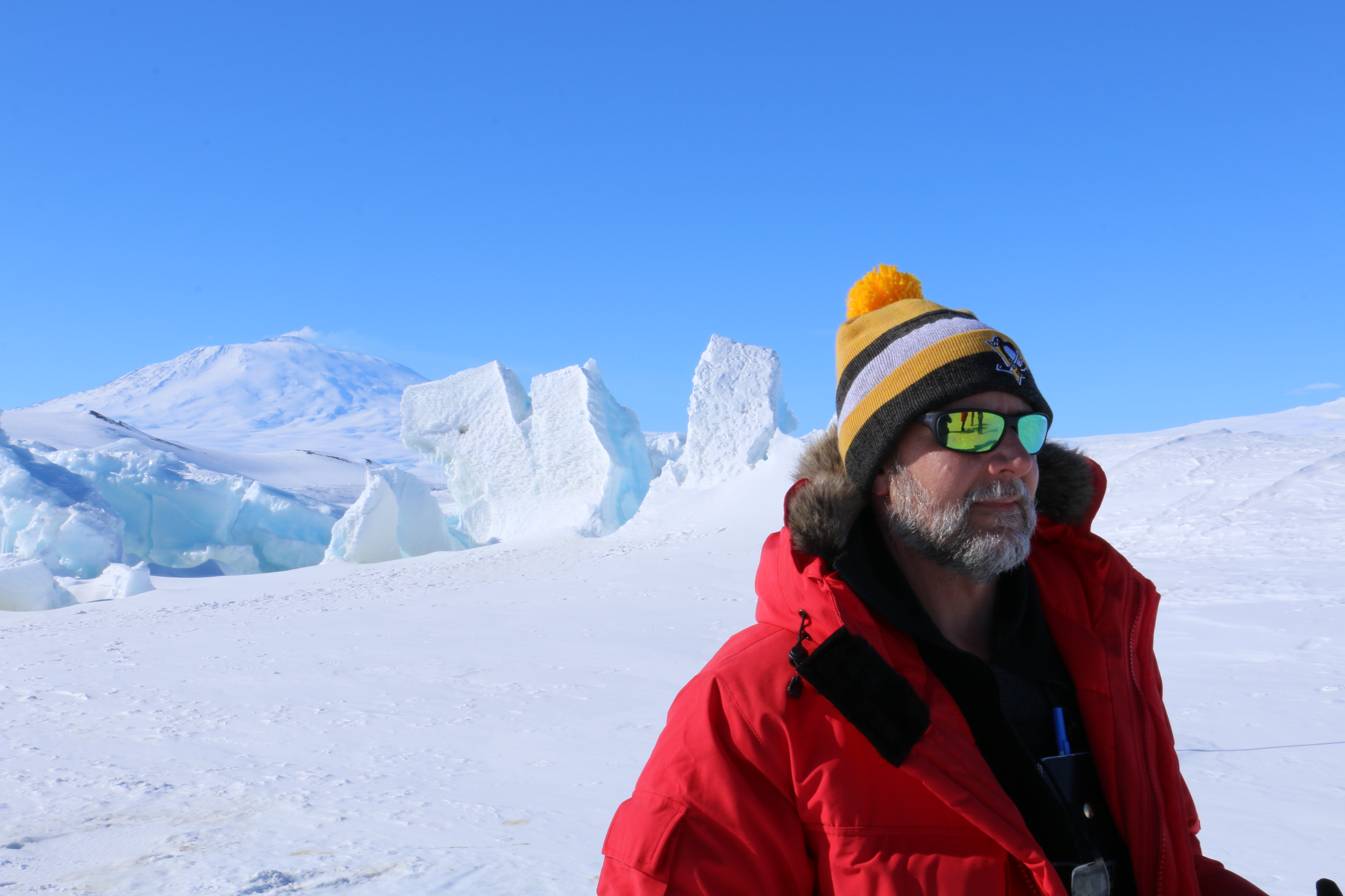 Mike Penn stands in front of a pressure ridge area near Scott Base, Antarctica. Mt. Erebus is in the background.