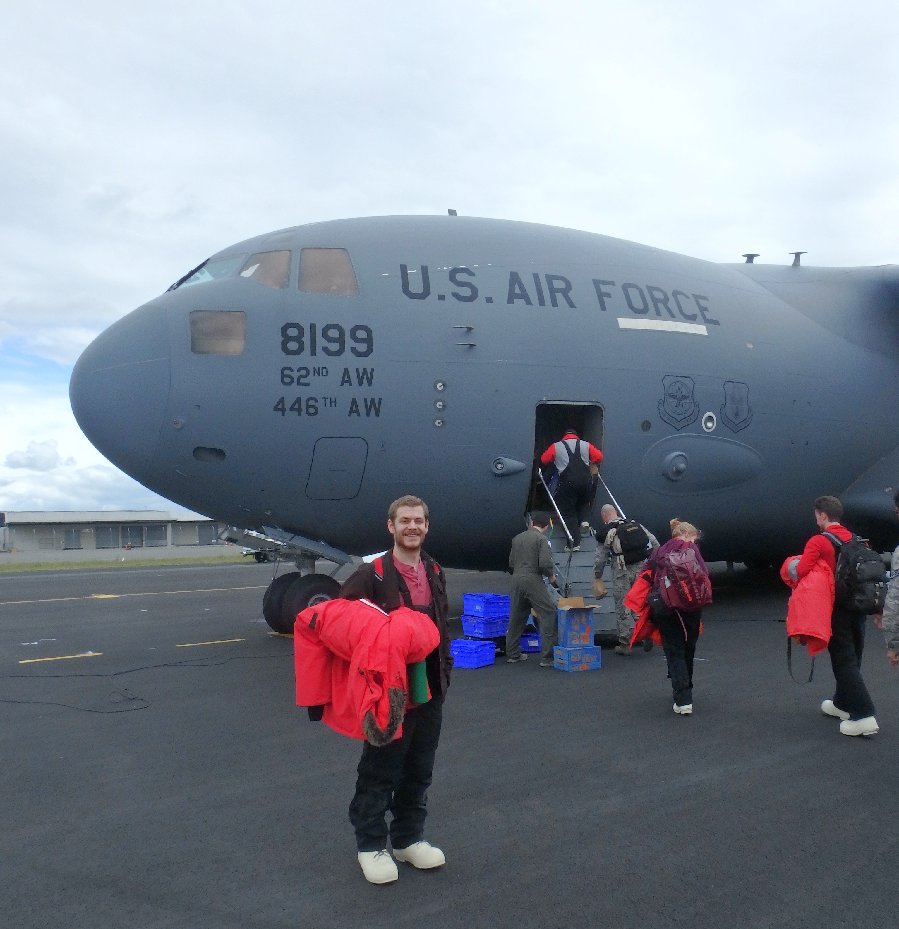 Forbes Filip and members of the Antarctic Automatic Weather Station team board the C-17 in Christchurch, New Zealand.