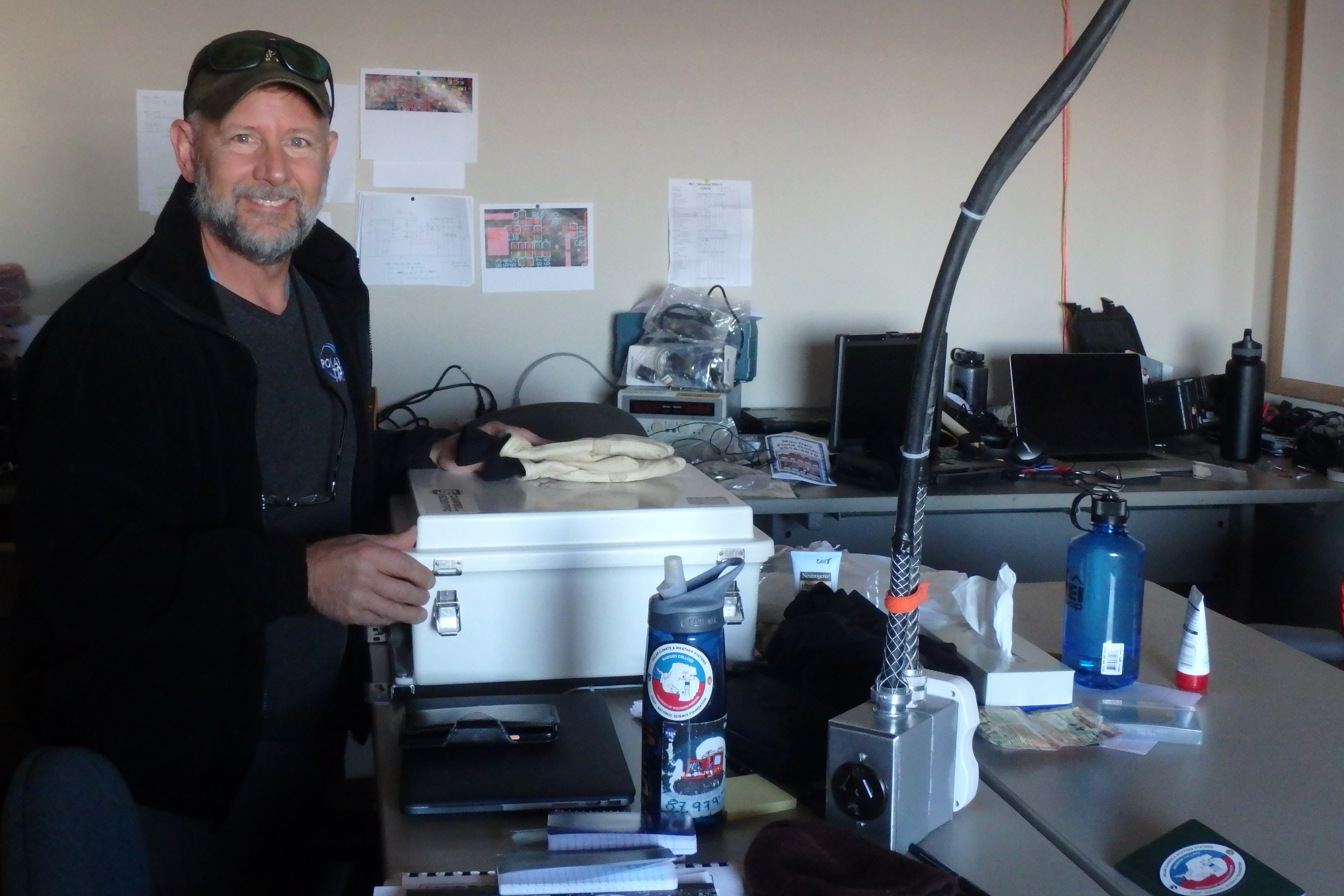 Mike Penn works on an Automatic Weather Station (AWS) enclosure in Crary Lab, McMurdo Station, Antarctica.