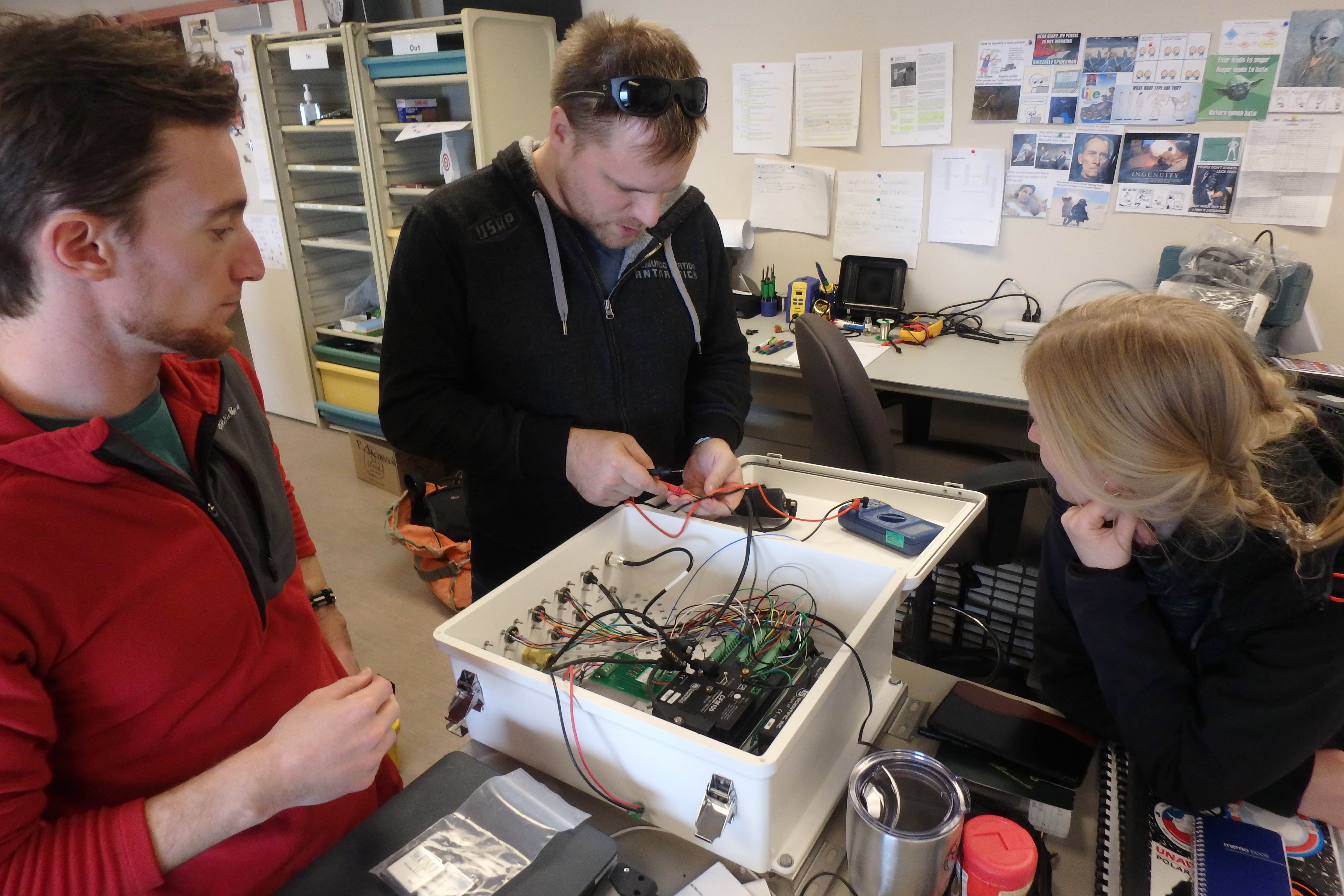 Left to right, David Mikolajczyk, Lee Welhouse, and Elina Valkonen do diagnostic checks on an enclosure for an Automatic Weather Station (AWS). Crary Lab, McMurdo Station, Antarctica.