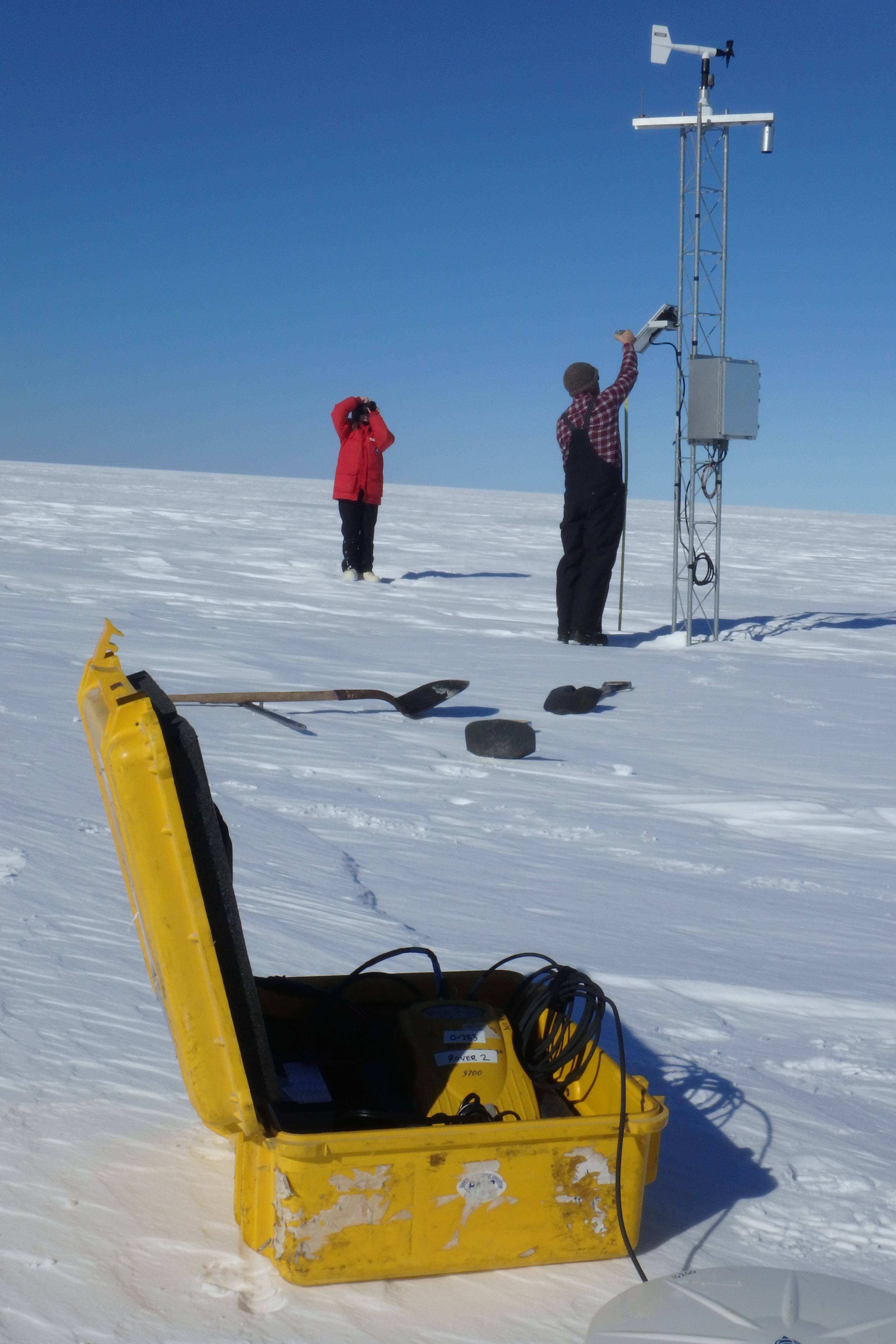 David Mikolajczyk and Lee Welhouse conduct initial inspection of the Laurie II Automatic Weather Station (AWS), Antarctica.