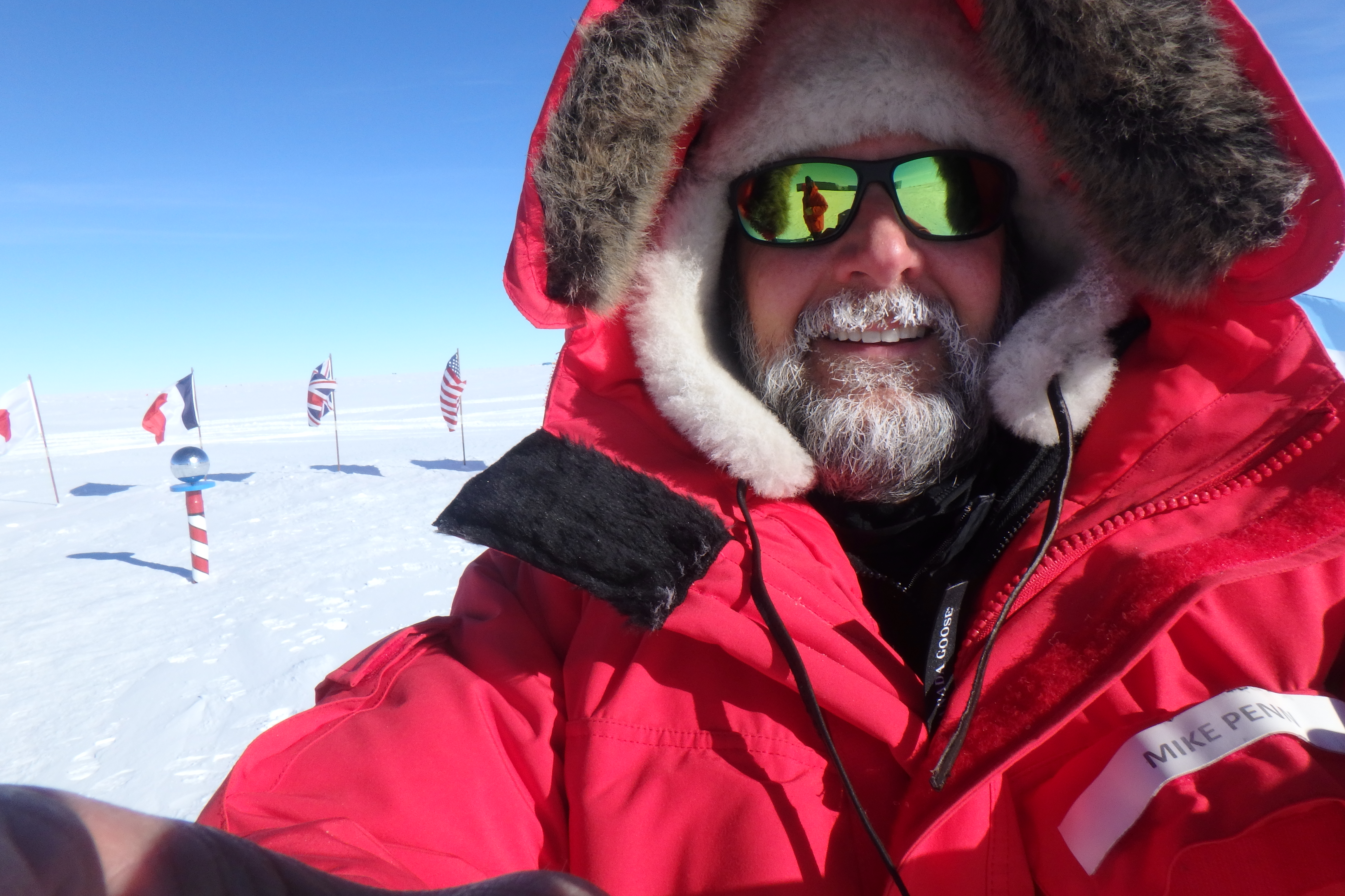 Mike Penn stands at the Ceremonial South Pole, about 50 meters from the South Pole Station and 100 meters from the Geographic South Pole. Amundsen–Scott South Pole Station, Antarctica.