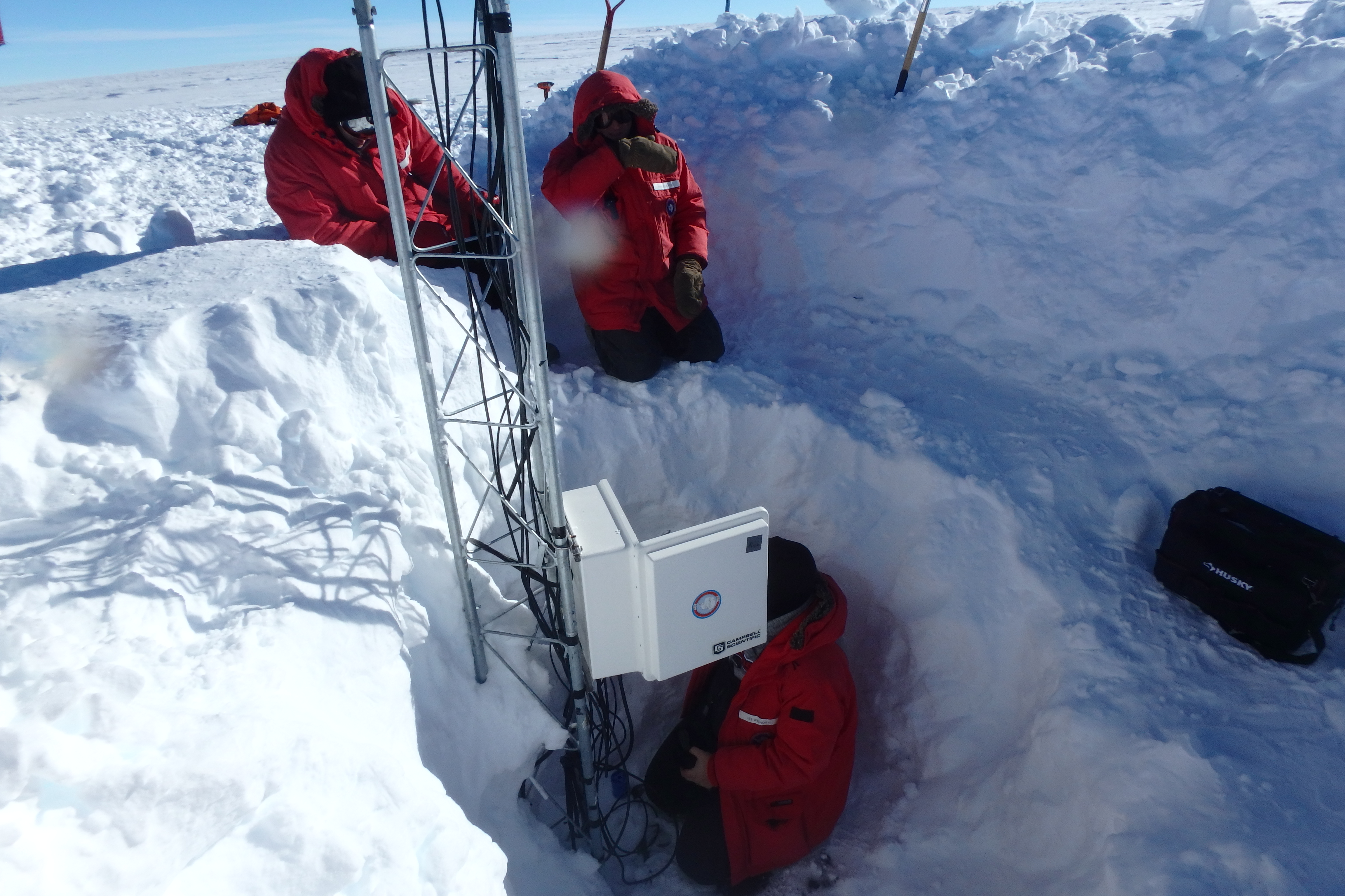 The instruments and the battery box are connected to the enclosure at the Henry Automatic Weather Station (AWS) in Antarctica.