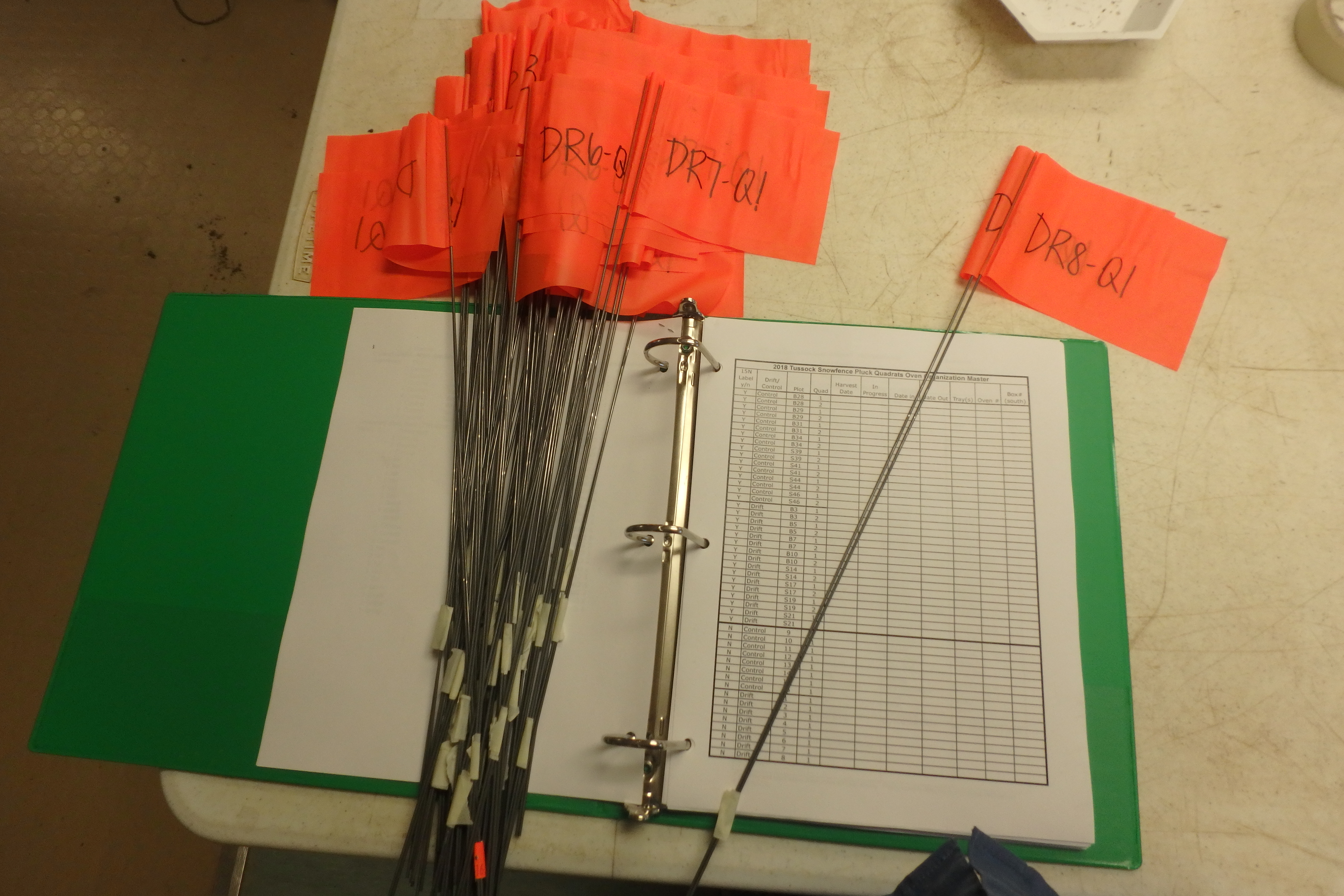 The team created labels on flags for specific quadrats for the Tussock Snowfence study. Toolik Field Station, Alaska.