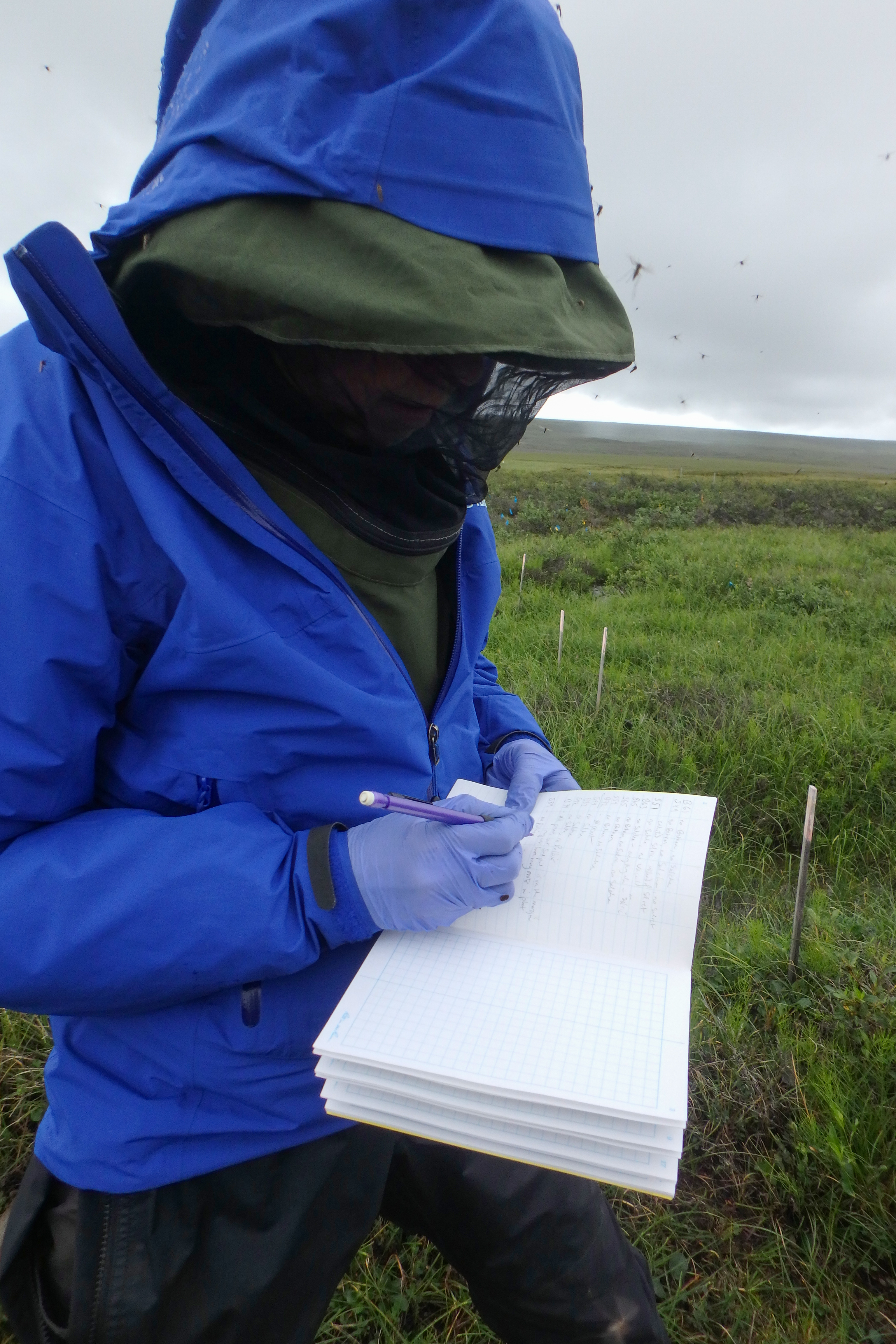 Dr. Bret-Harte writes in her field journal at the Riparian Snowfence field site. Toolik Field Station, Alaska.
