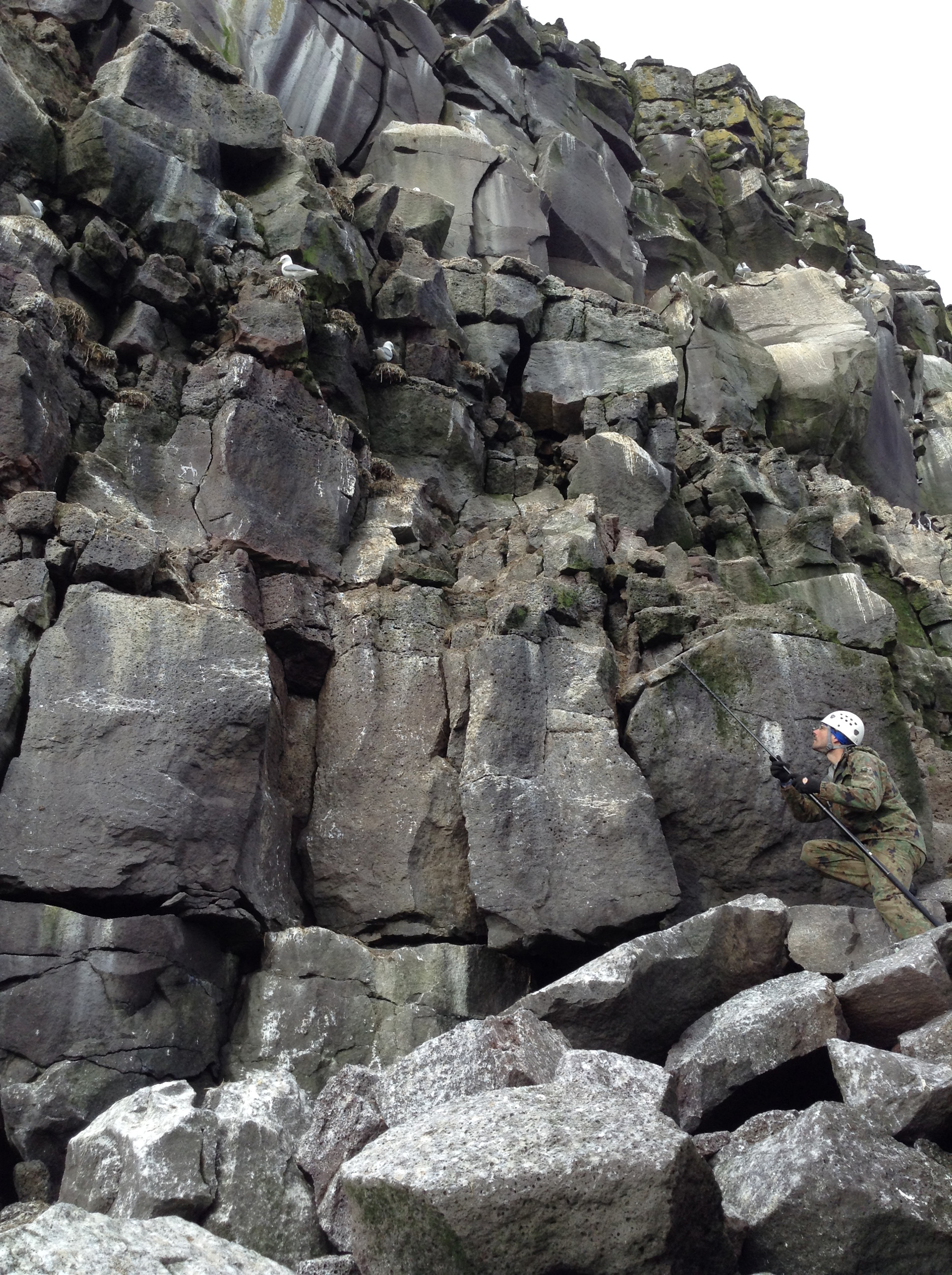 Researcher JB Thiebot, noose pole in hand, goes after his next capture. Cape Myaughee, St. Lawrence Island, Alaska.