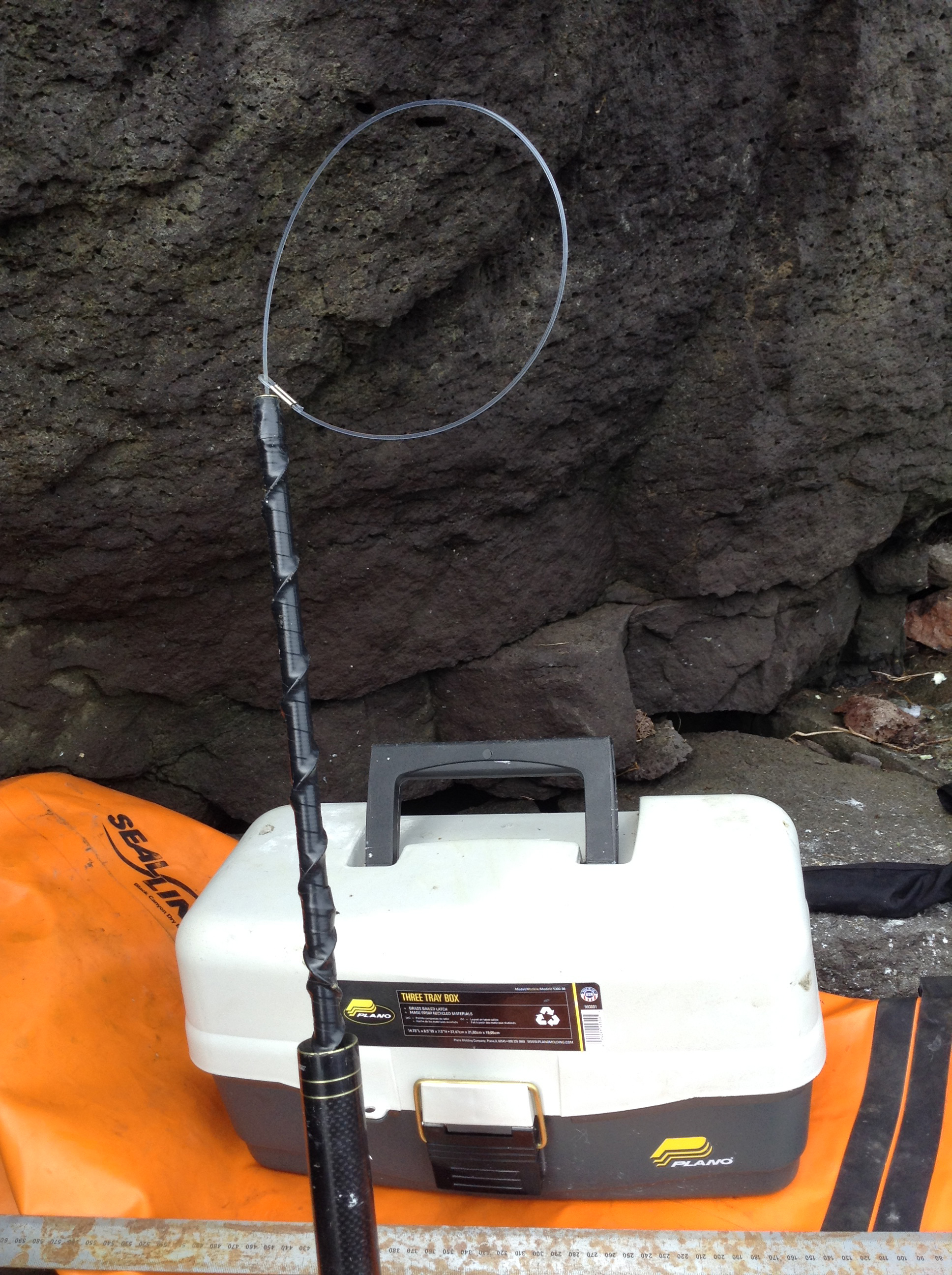 The noose pole (used to safely catch birds) and the team's field supplies for post-capture. Cape Myaughee, St. Lawrence Island, Alaska.