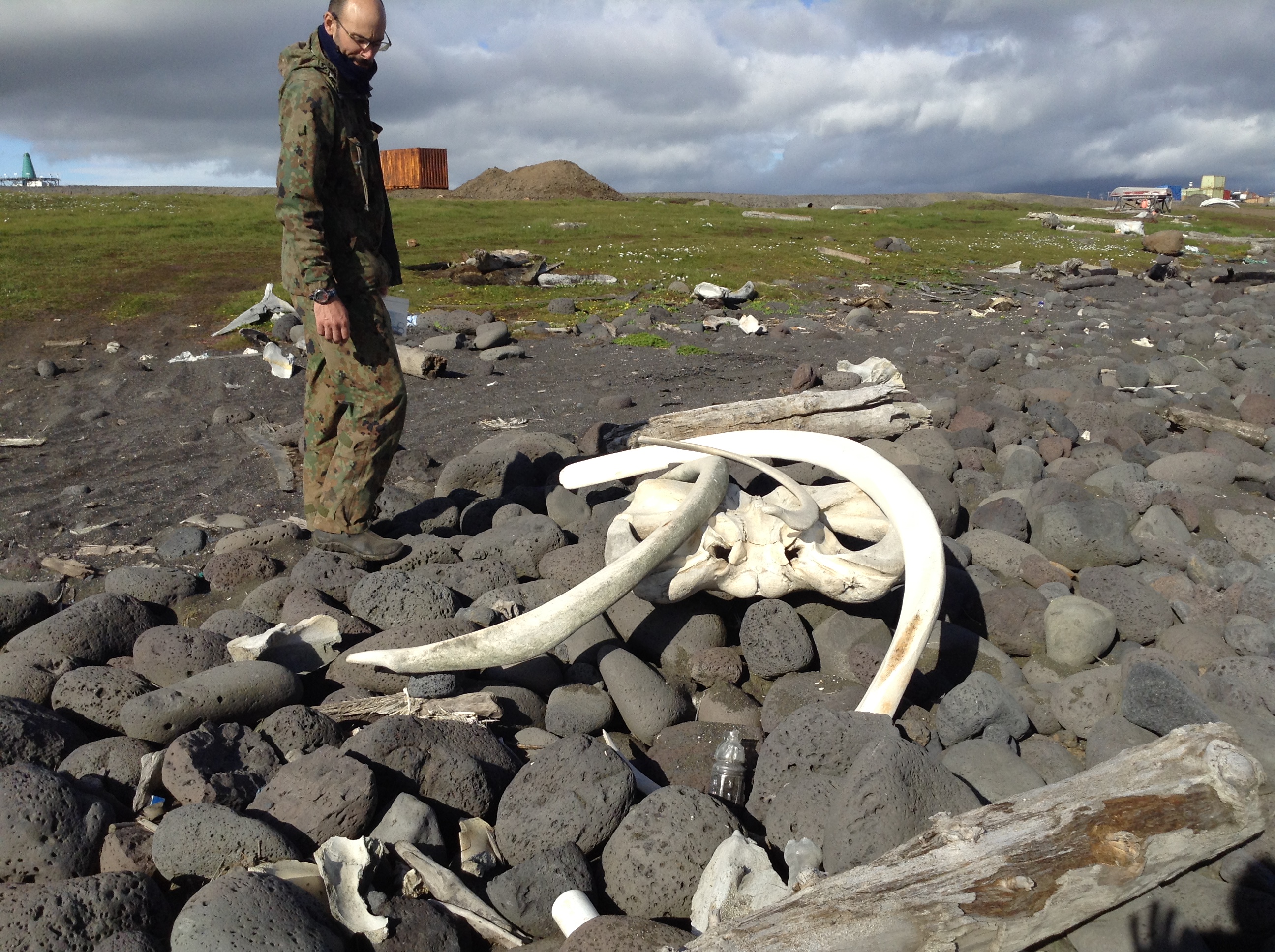 JB Thiebot stands next to rib bones from a whale. St. Lawrence Island, Alaska.