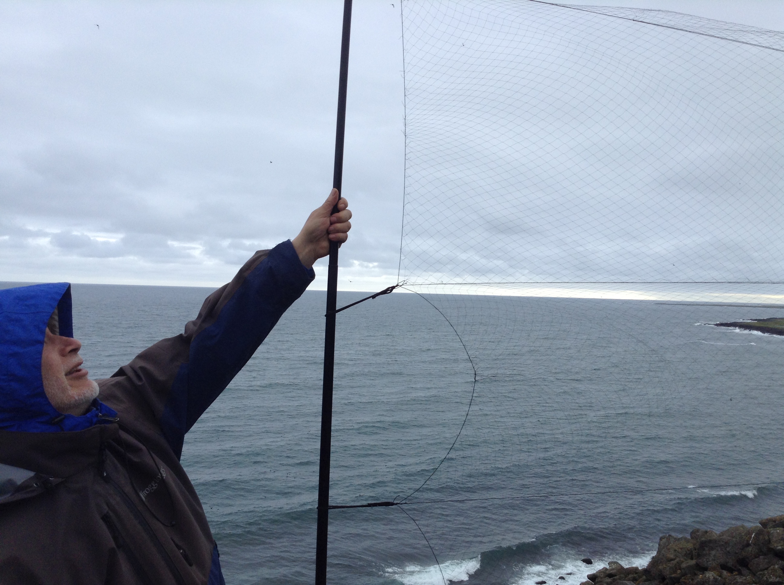 Sasha Kitaysky extends the net just high enough to be able to reach the auklets that might land in the upper area. Cape Myaughee, St. Lawrence Island, Alaska.