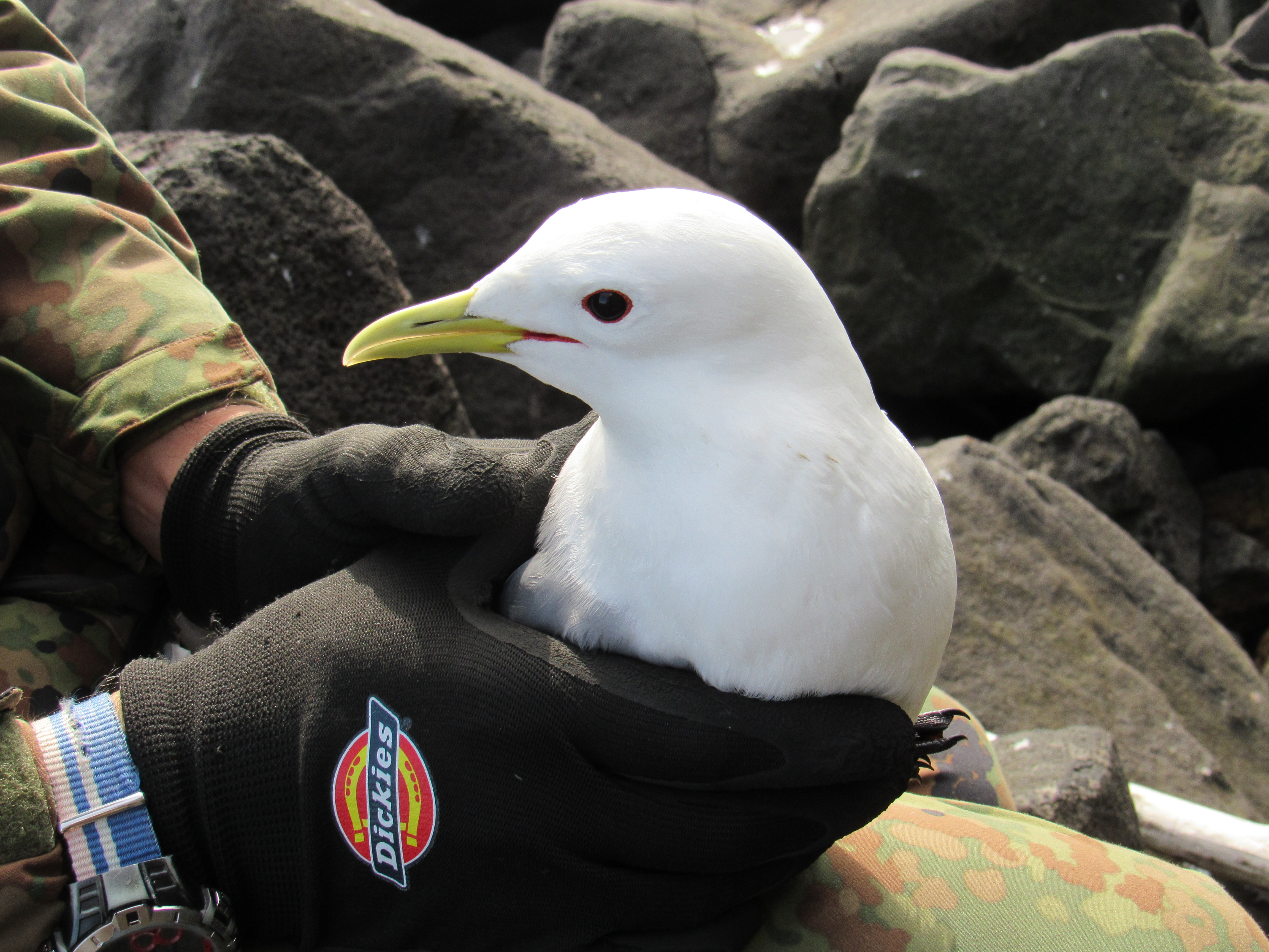 This kittiwake is calm after being captured. Cape Myaughee, St. Lawrence Island, Alaska.