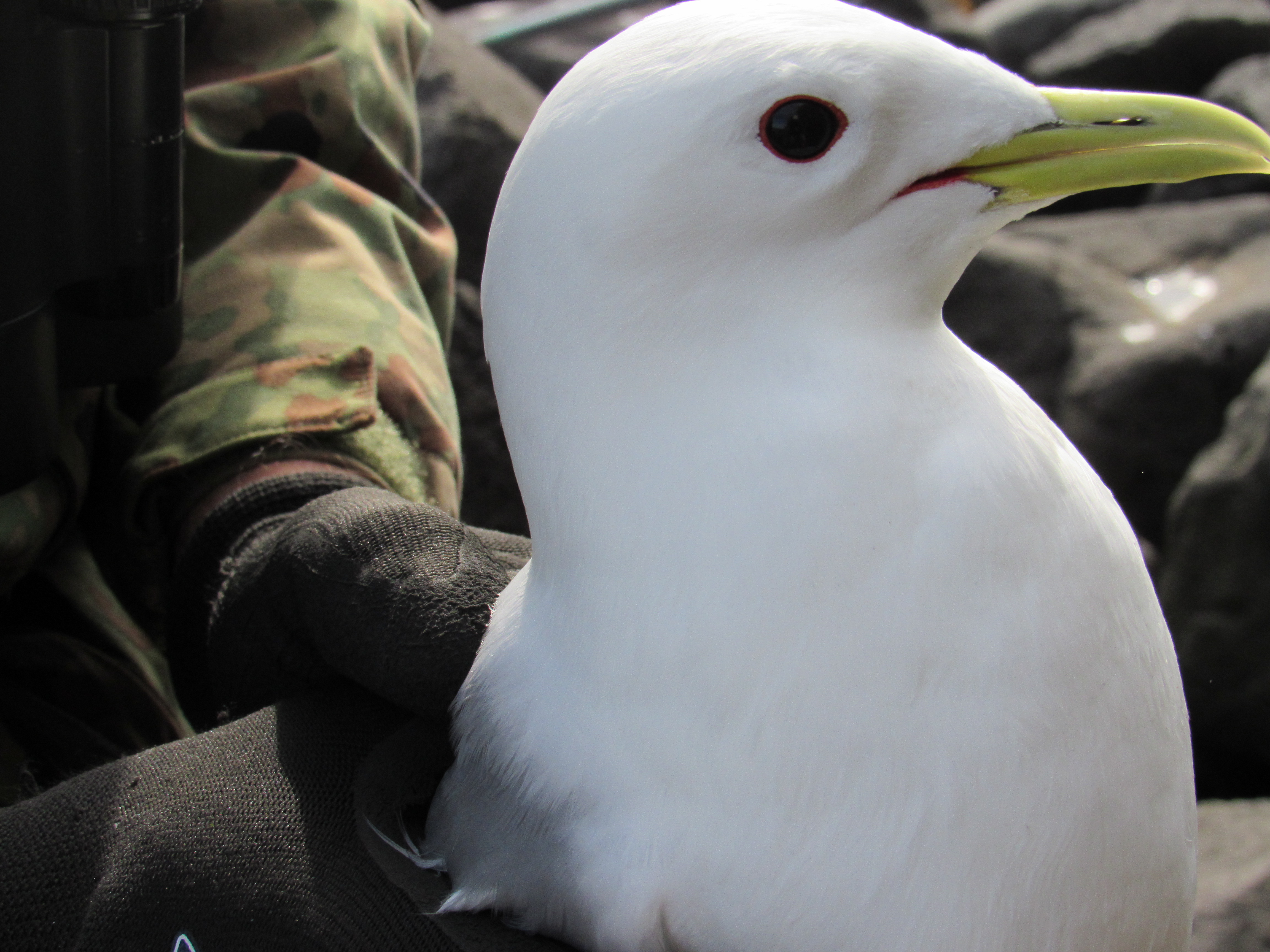 This kittiwake is calm after being captured. Cape Myaughee, St. Lawrence Island, Alaska.