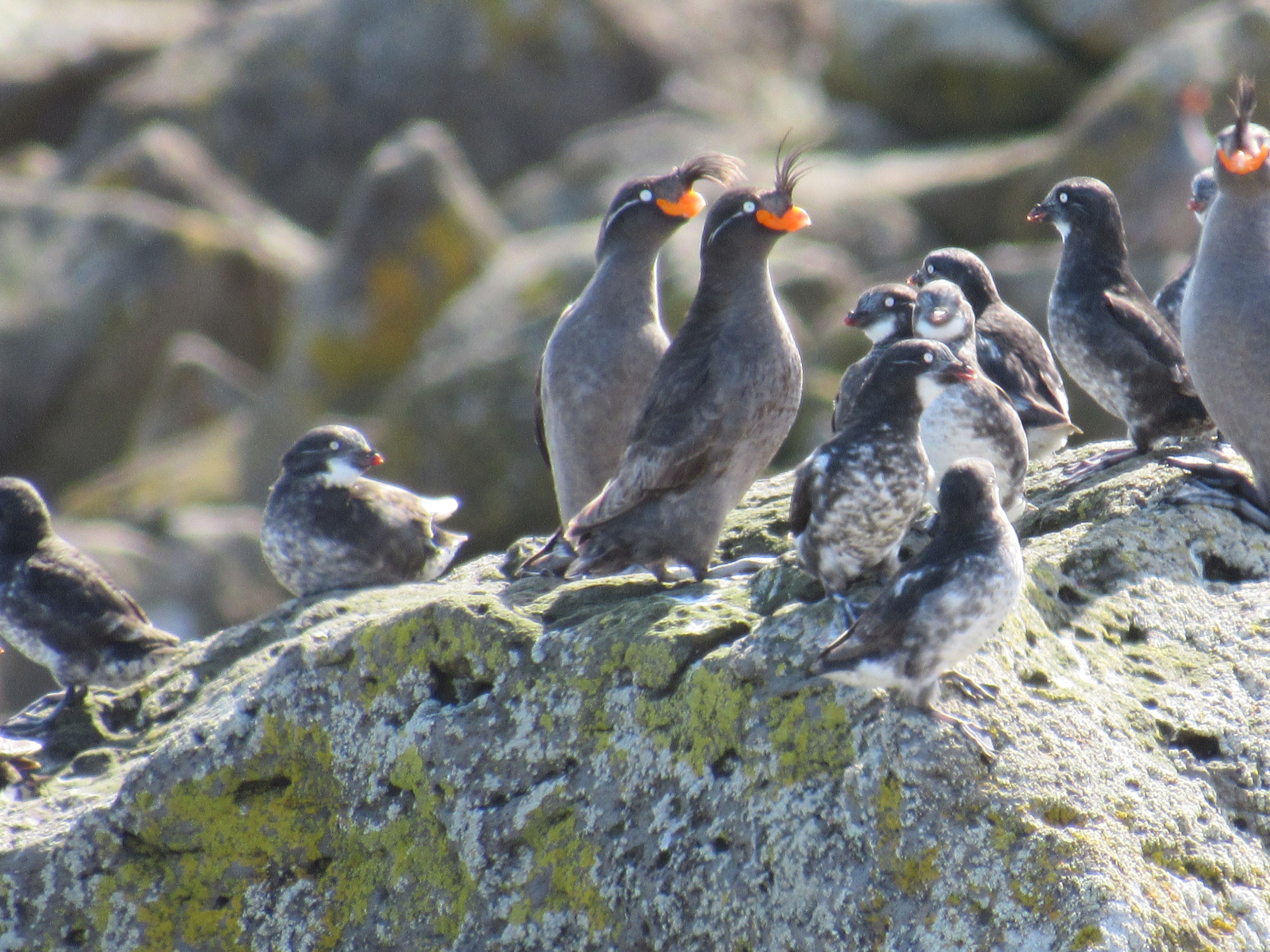 Crested auklets and least auklets at Cape Myaughee, St. Lawrence Island, Alaska.