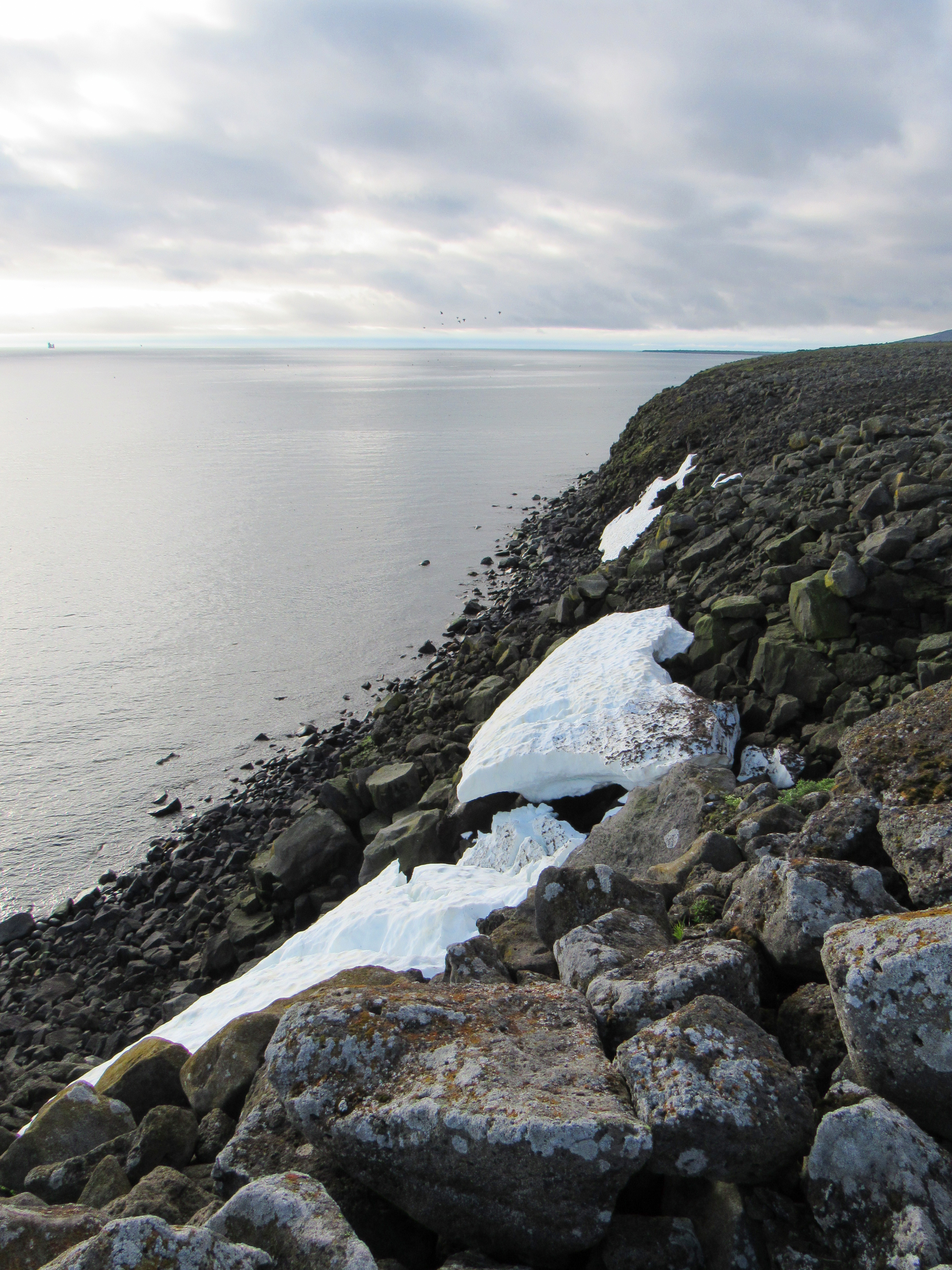 Snow can still be found on the cliffs on July 20th. Cape Kitnik, St. Lawrence Island, Alaska.