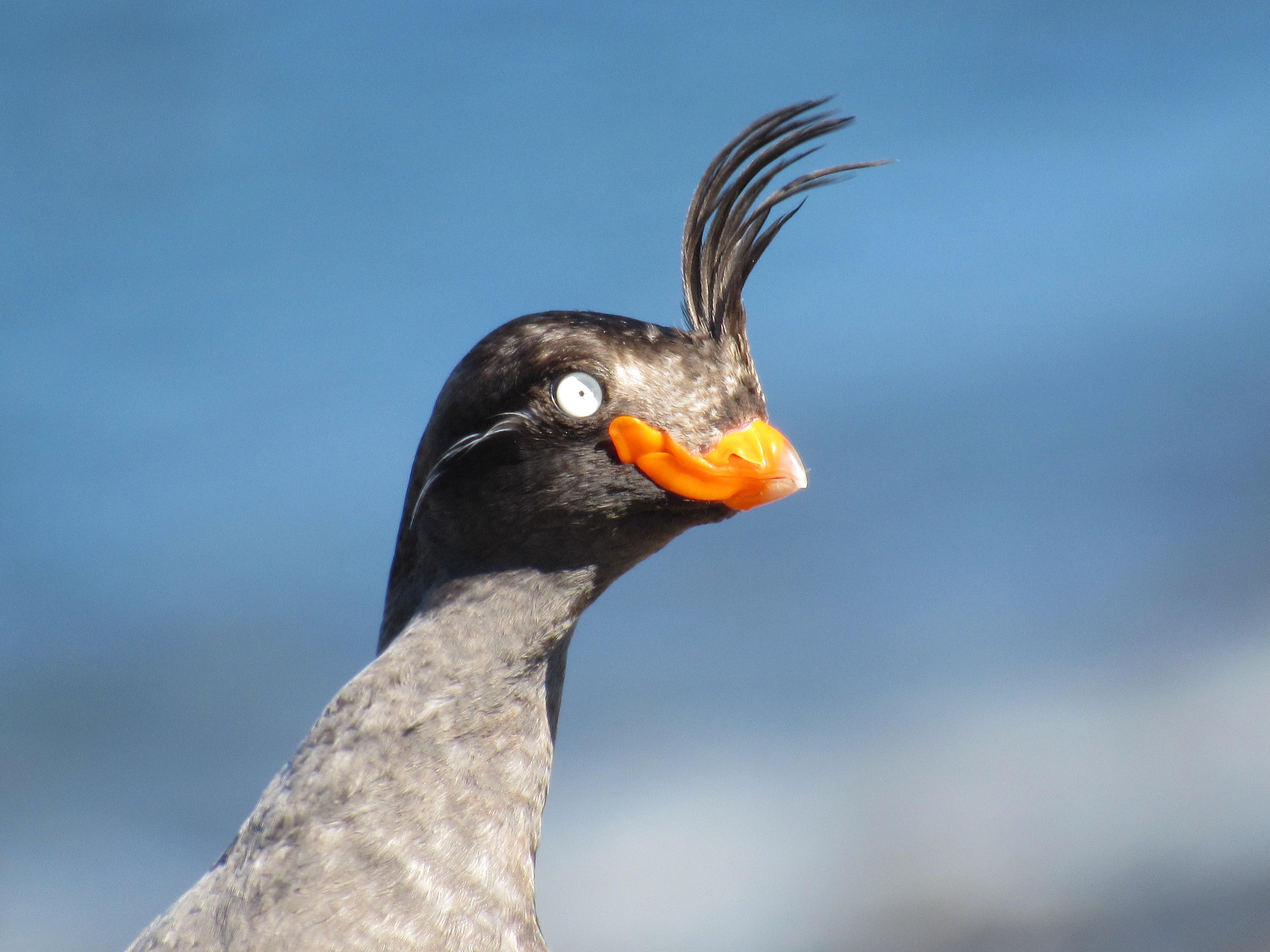 A close-up of the brilliant colors of the crested auklet. Cape Kitnik, St. Lawrence Island, Alaska.