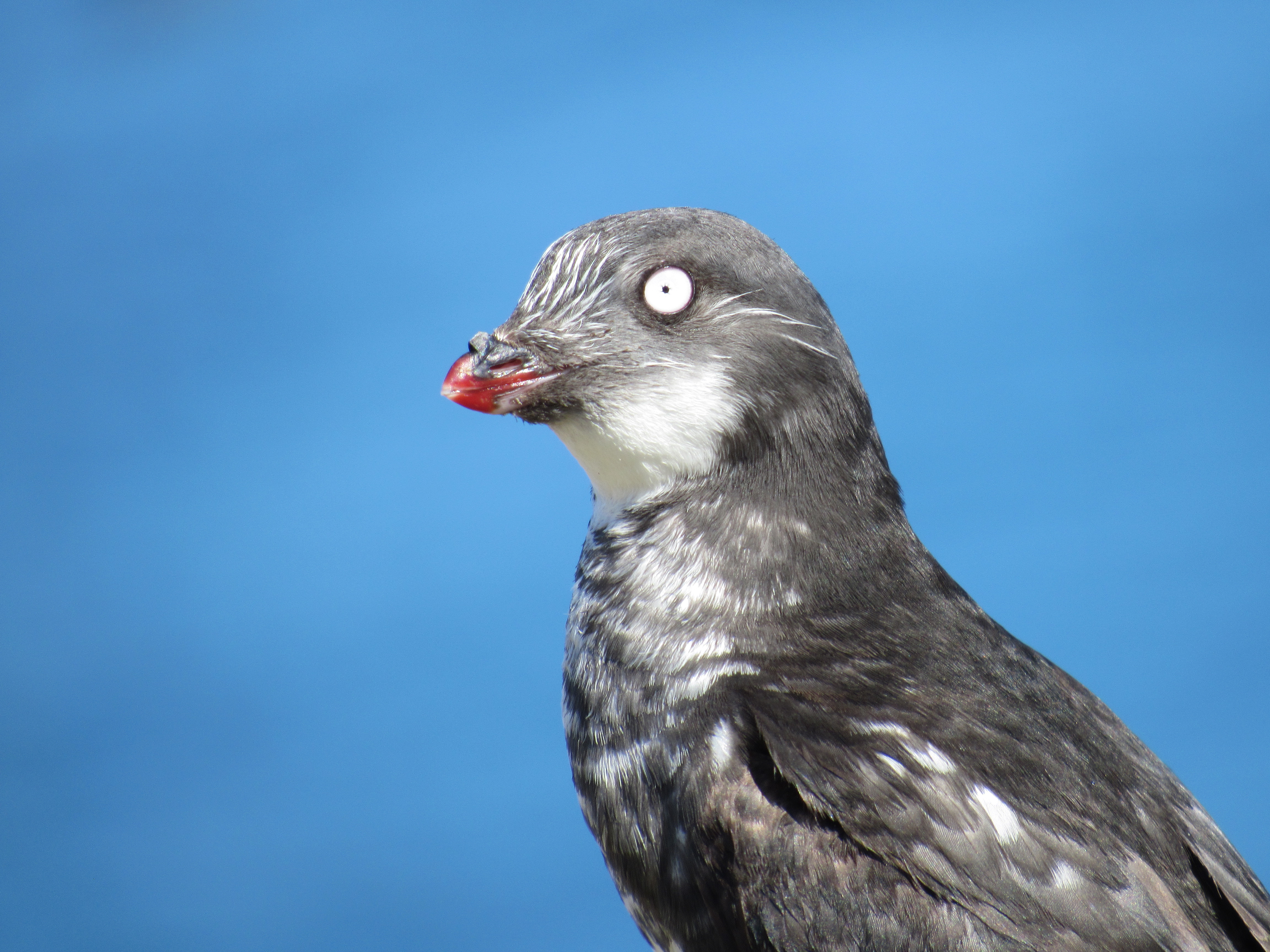 A close-up of the least auklet, with its reddish bill and telltale knob at the base of the upper beak. Cape Kitnik, St. Lawrence Island, Alaska.