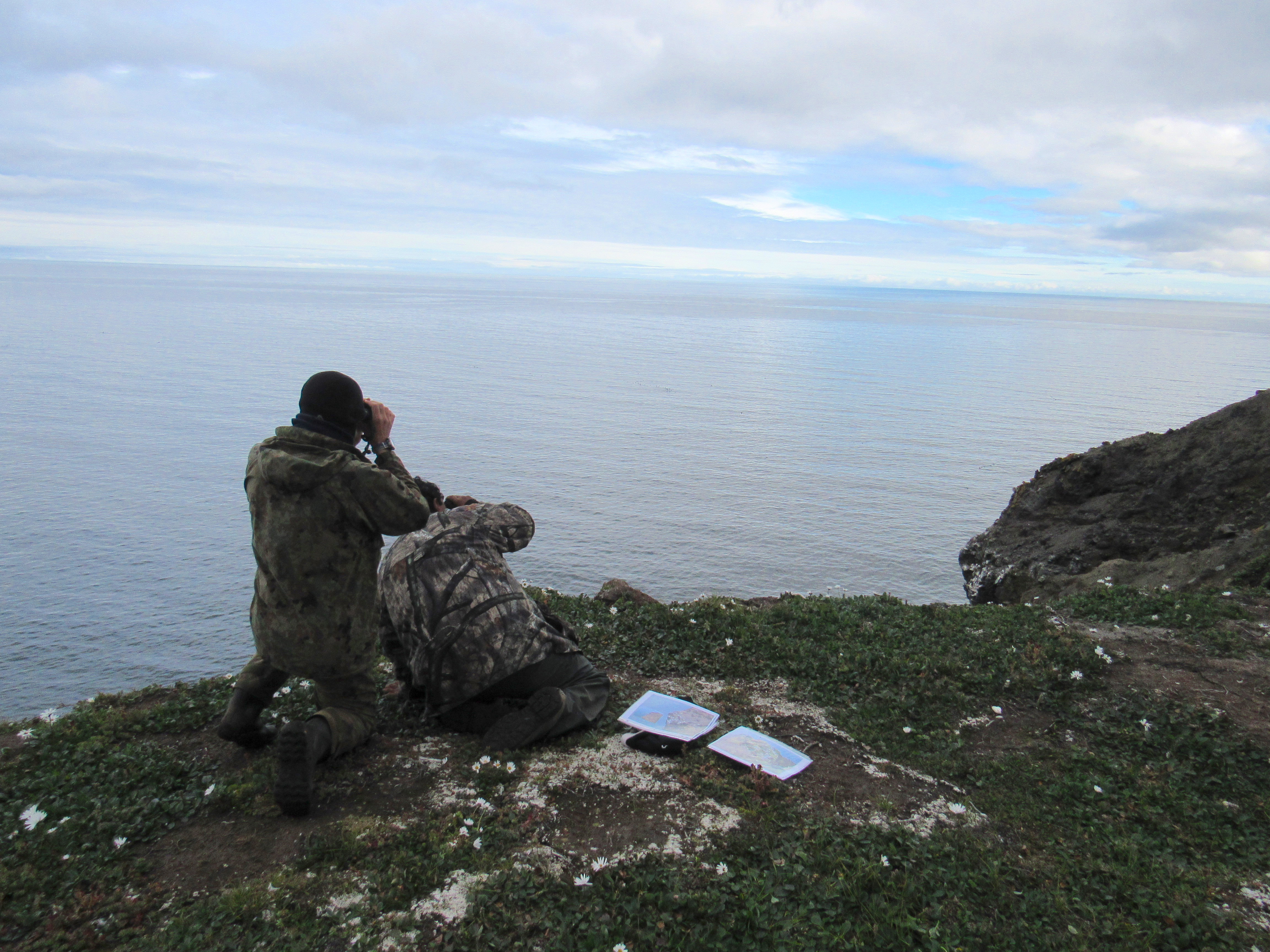 Team members use binoculars to count birds from a distance. Kiveepuk Bay, St. Lawrence Island, Alaska.