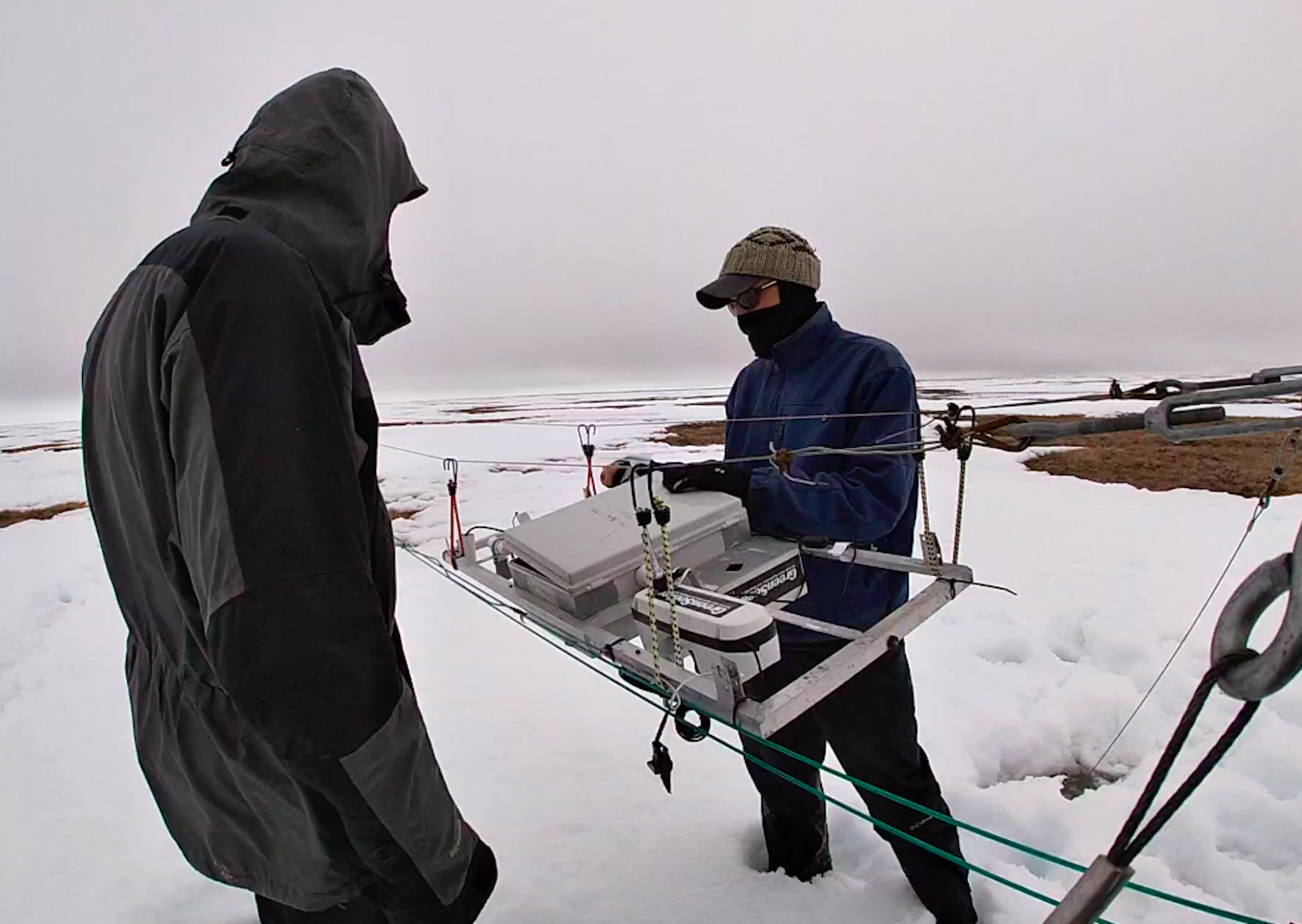 Steve Oberbauer and Jeremy May set up the Mobile Instrumented Sensor Platform (MISP) tram. Utqiaġvik, Alaska.