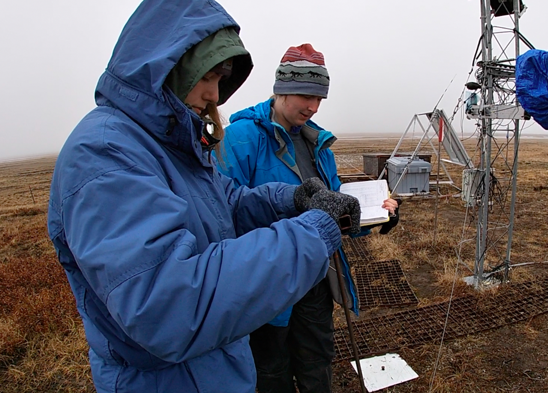 Hannah Clarida and Becca Daigle measure the depth of the thawing permafrost. Atqasuk, Alaska.