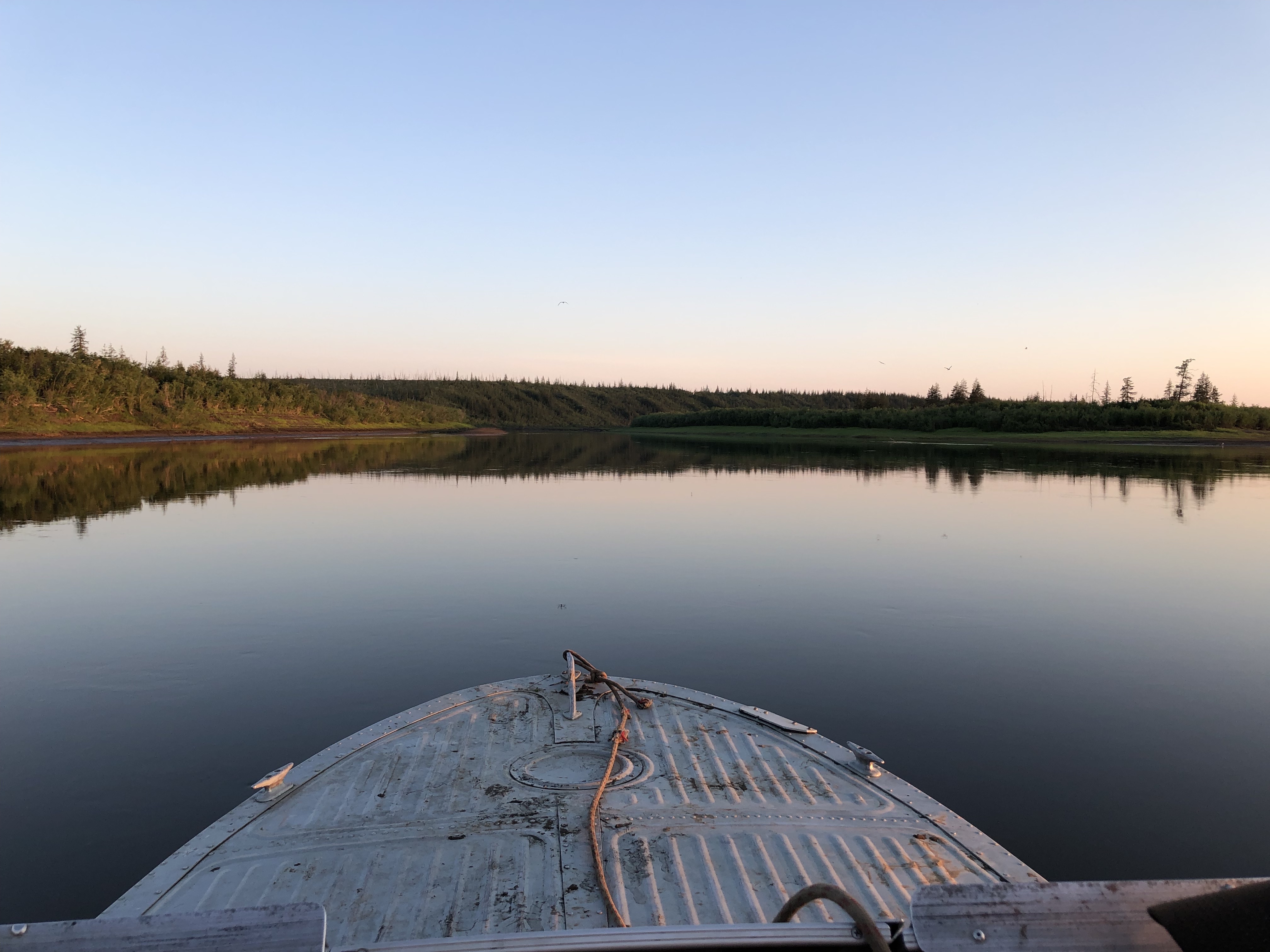 The Anyuy River is very calm as the team makes their way to the next larch tree stand to collect data. Chersky, Russia.