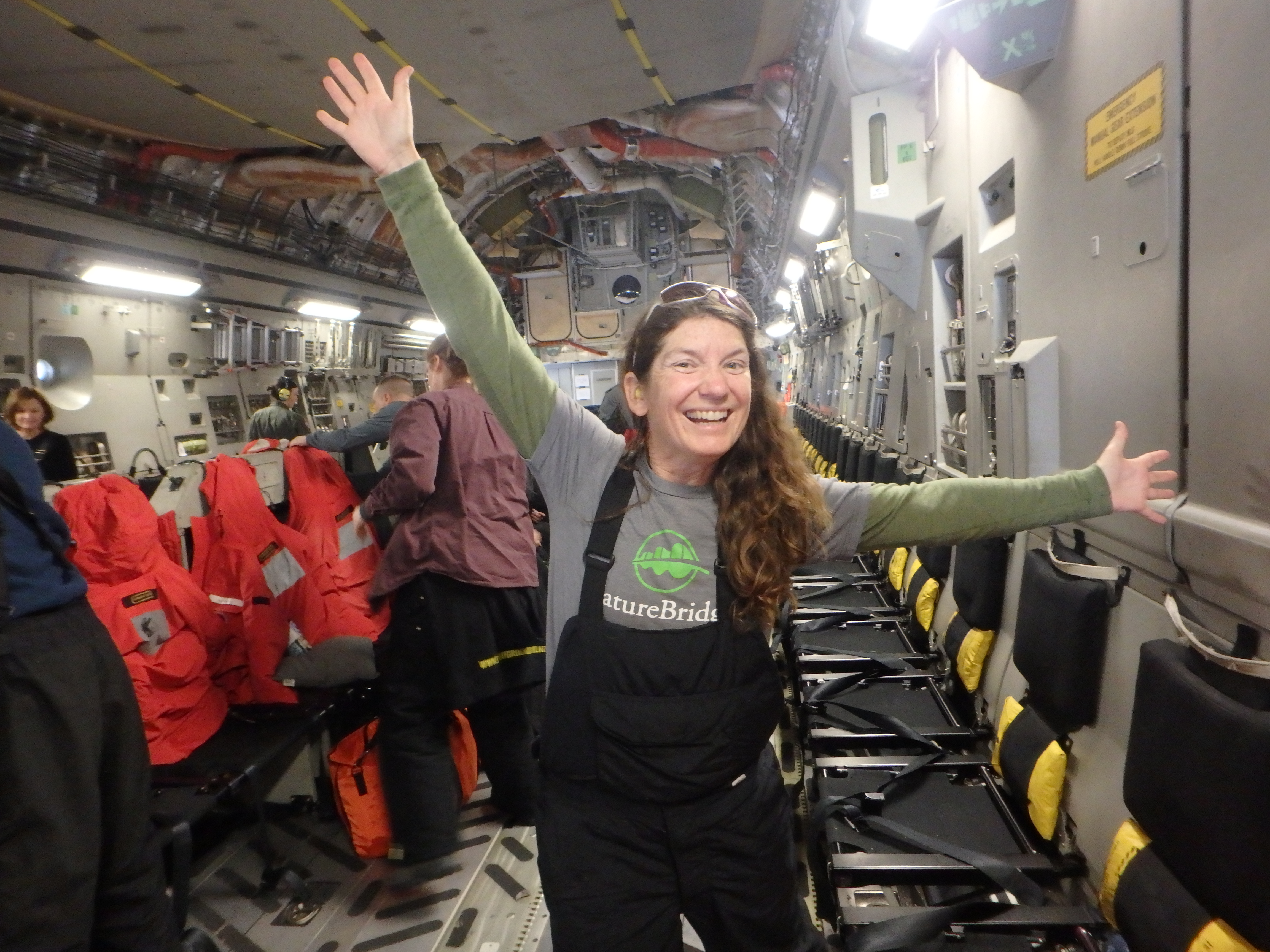 Amy Osborne inside the C-17, happy to be headed to Antarctica. Somewhere between New Zealand and Antarctica.