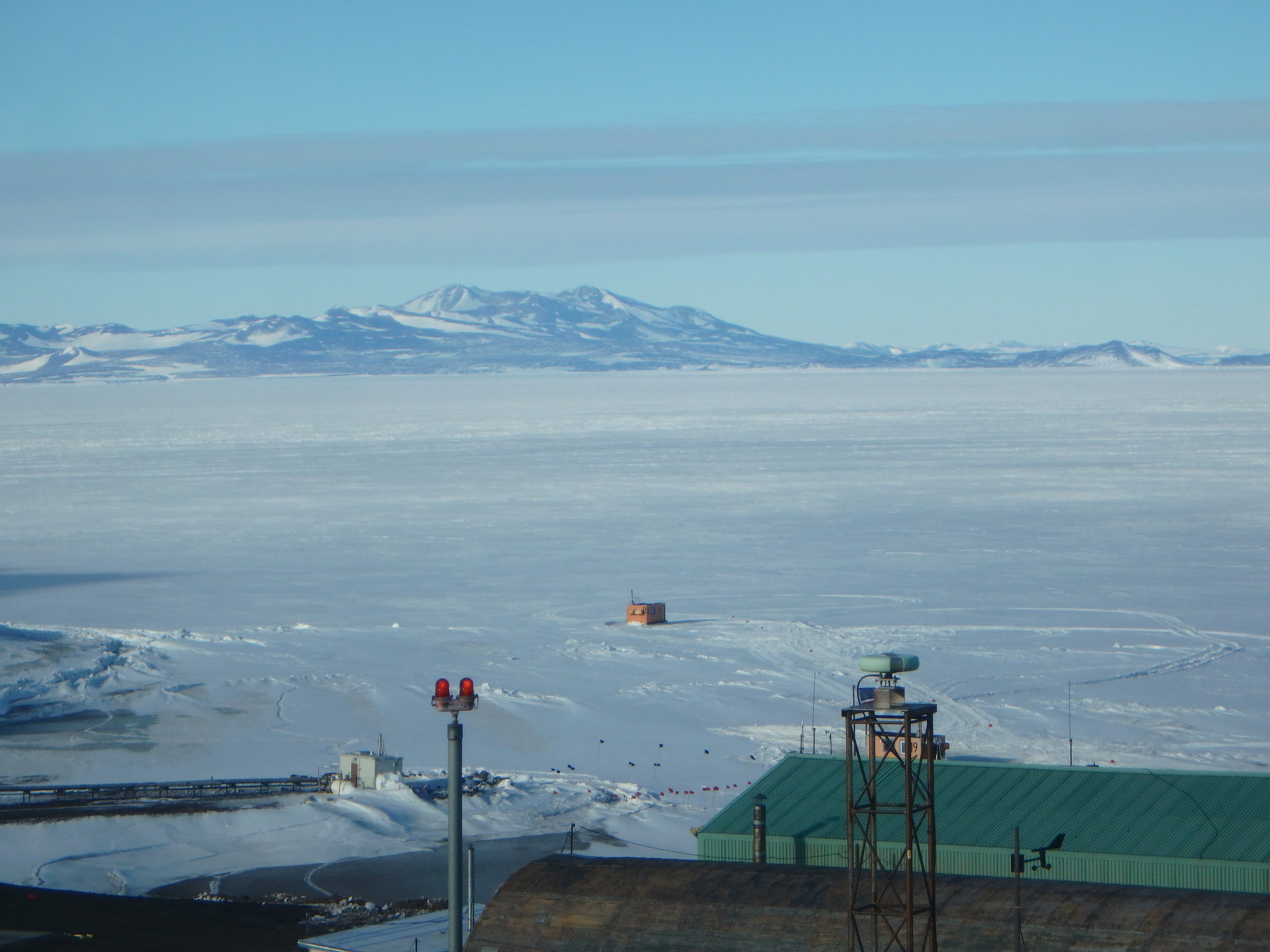 A view out the window of Crary Lab of sea ice, mountains, and an orange dive hut on the sea ice. Crary Lab, McMurdo Station, Antarctica.