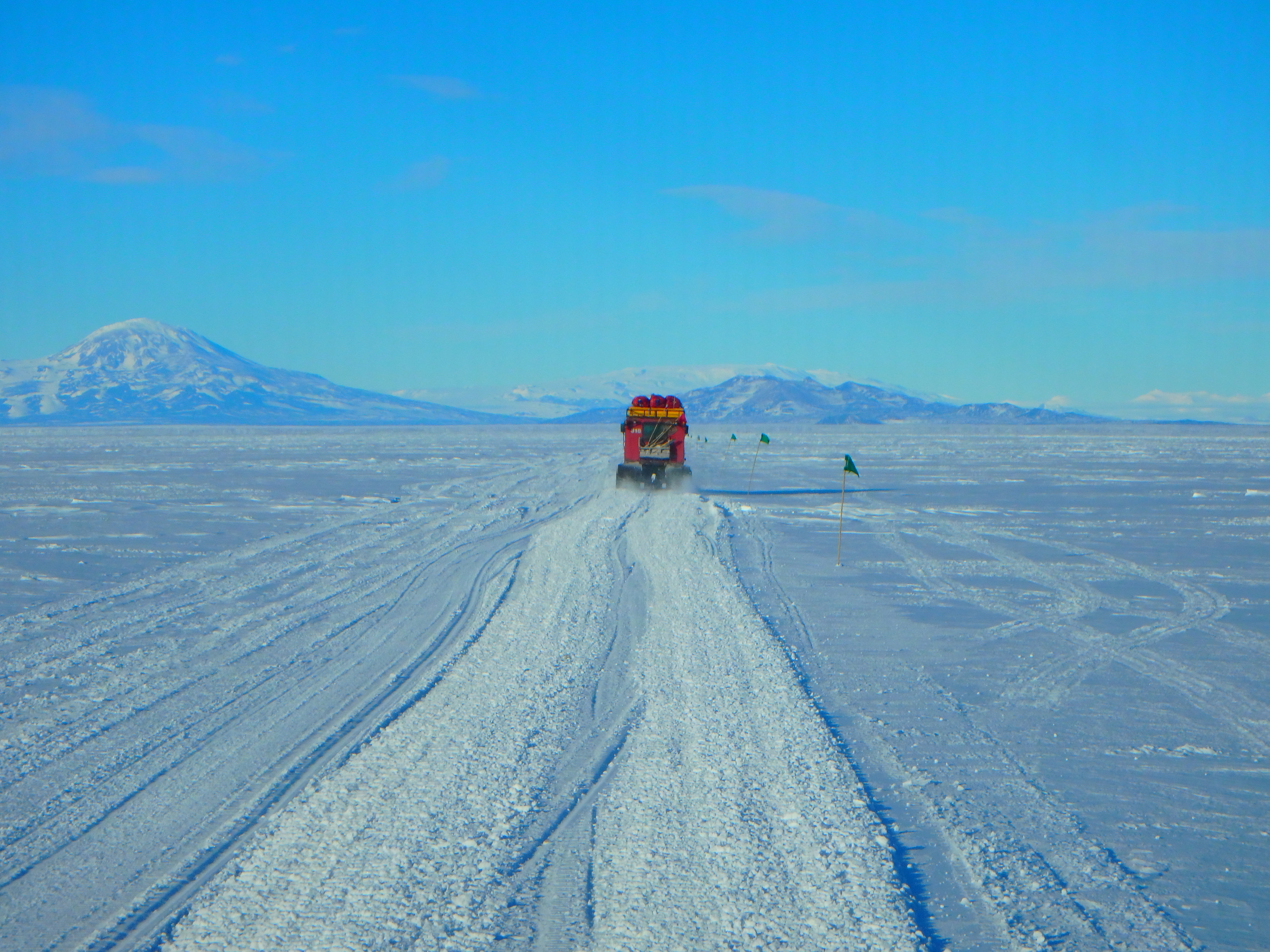 A PistenBully travels across the sea ice on McMurdo Sound, Antarctica. Mount Erebus is seen in the background.