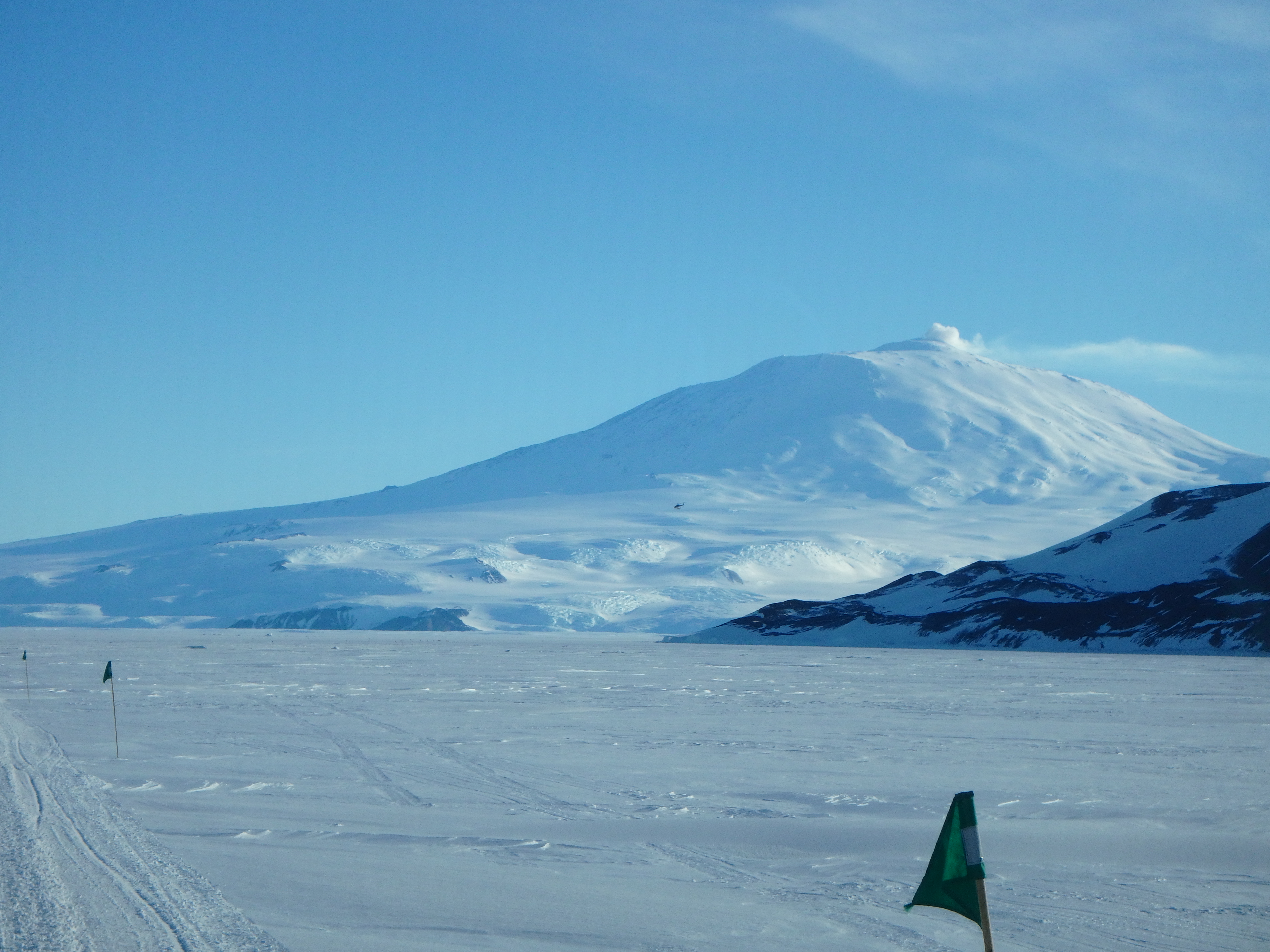 Green flags on the sea ice mark the roadway towards Mount Erebus. McMurdo Sound, Antarctica.