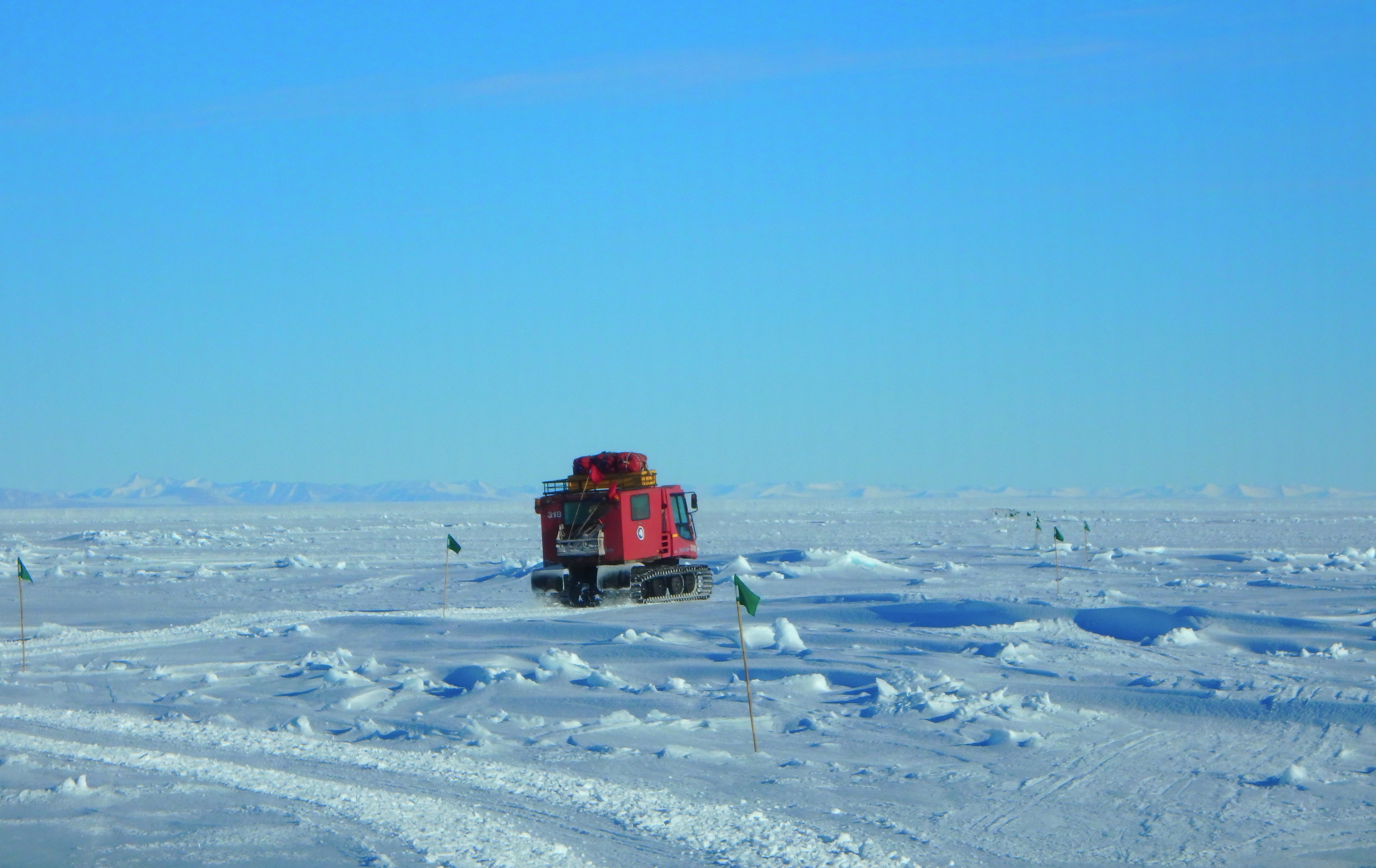 A PistenBully travels across rafted ice in McMurdo Sound, Antarctica.