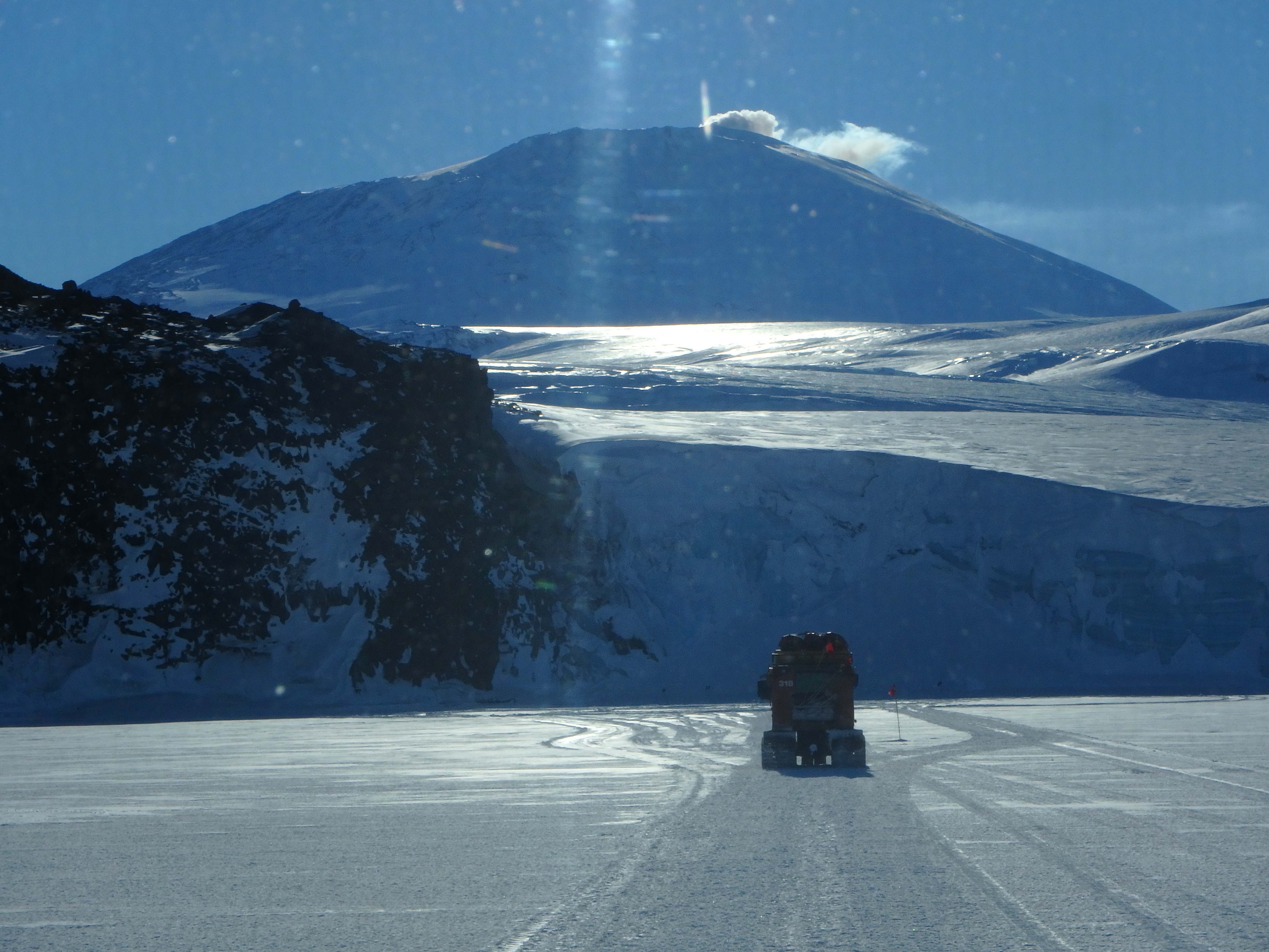 A PistenBully drives on the sea ice in McMurdo Sound, Antarctica with Mount Erebus in the background.