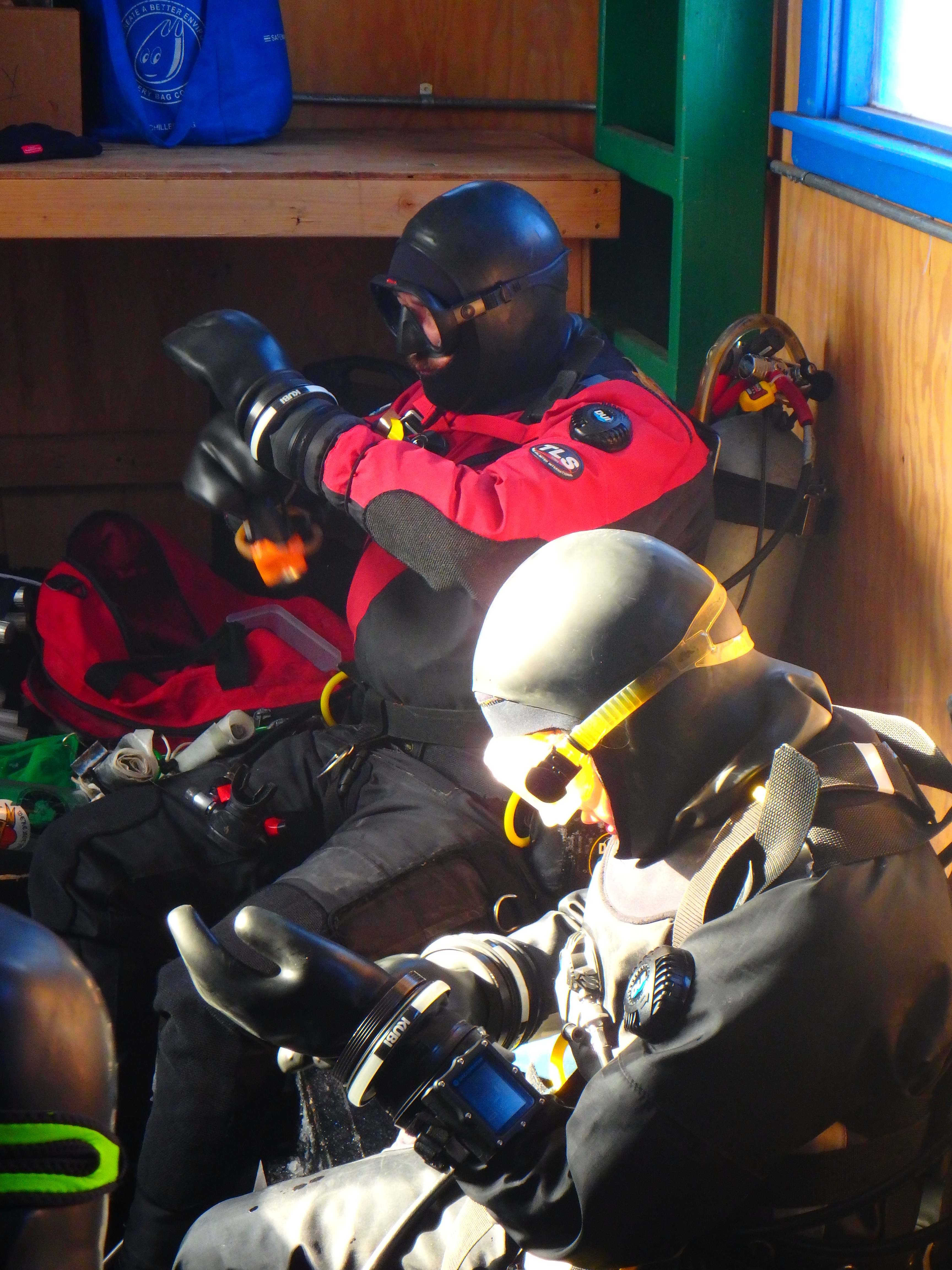 Science diver Steve Rupp and researcher Dr. Amy Moran put on dry suit gloves before diving below the sea ice. Cape Evans, Antarctica.