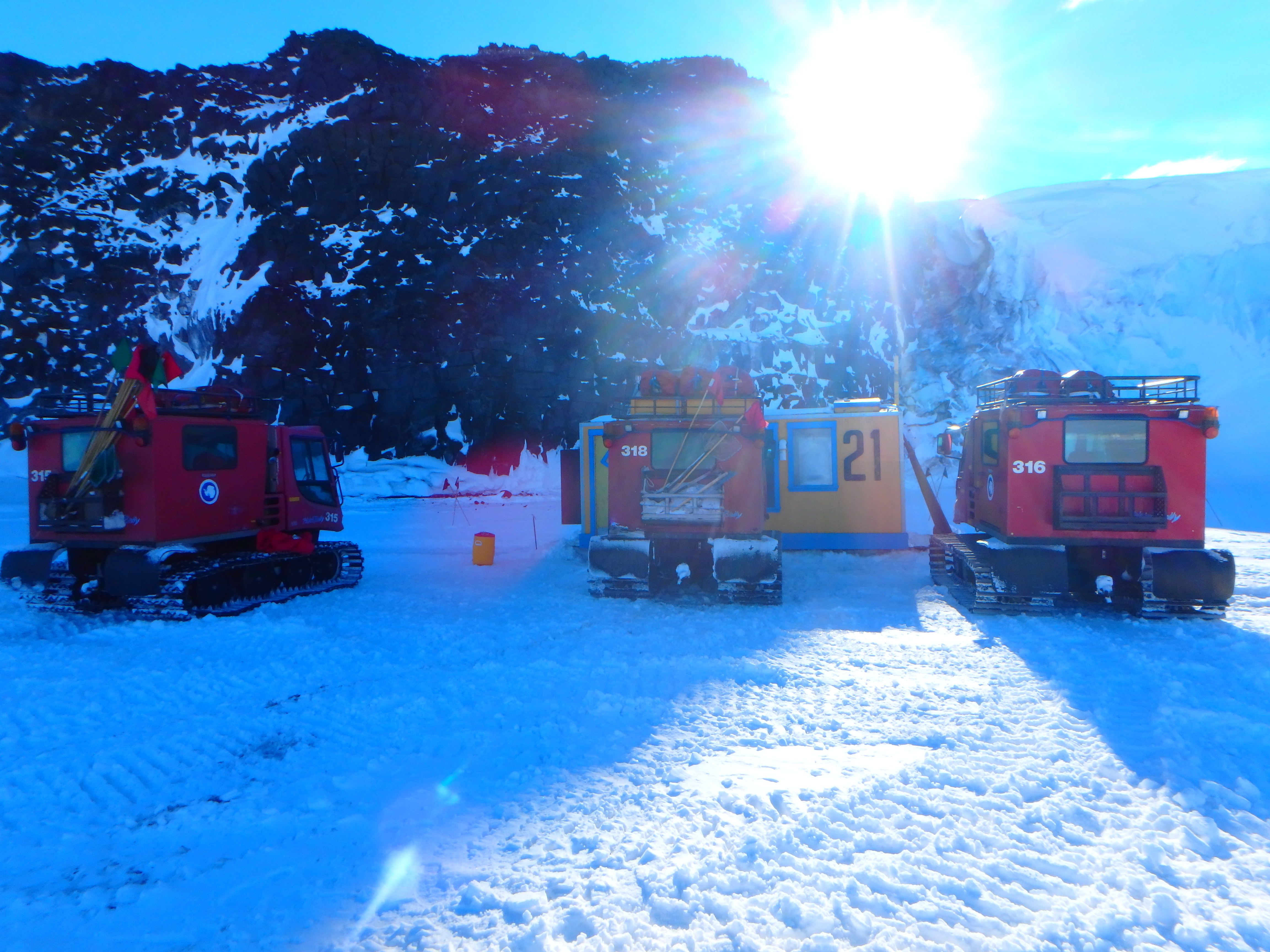 PistenBullys are the means of transportation for divers and dive tenders to get to the dive hunts from McMurdo Station. Cape Evans, Antarctica.