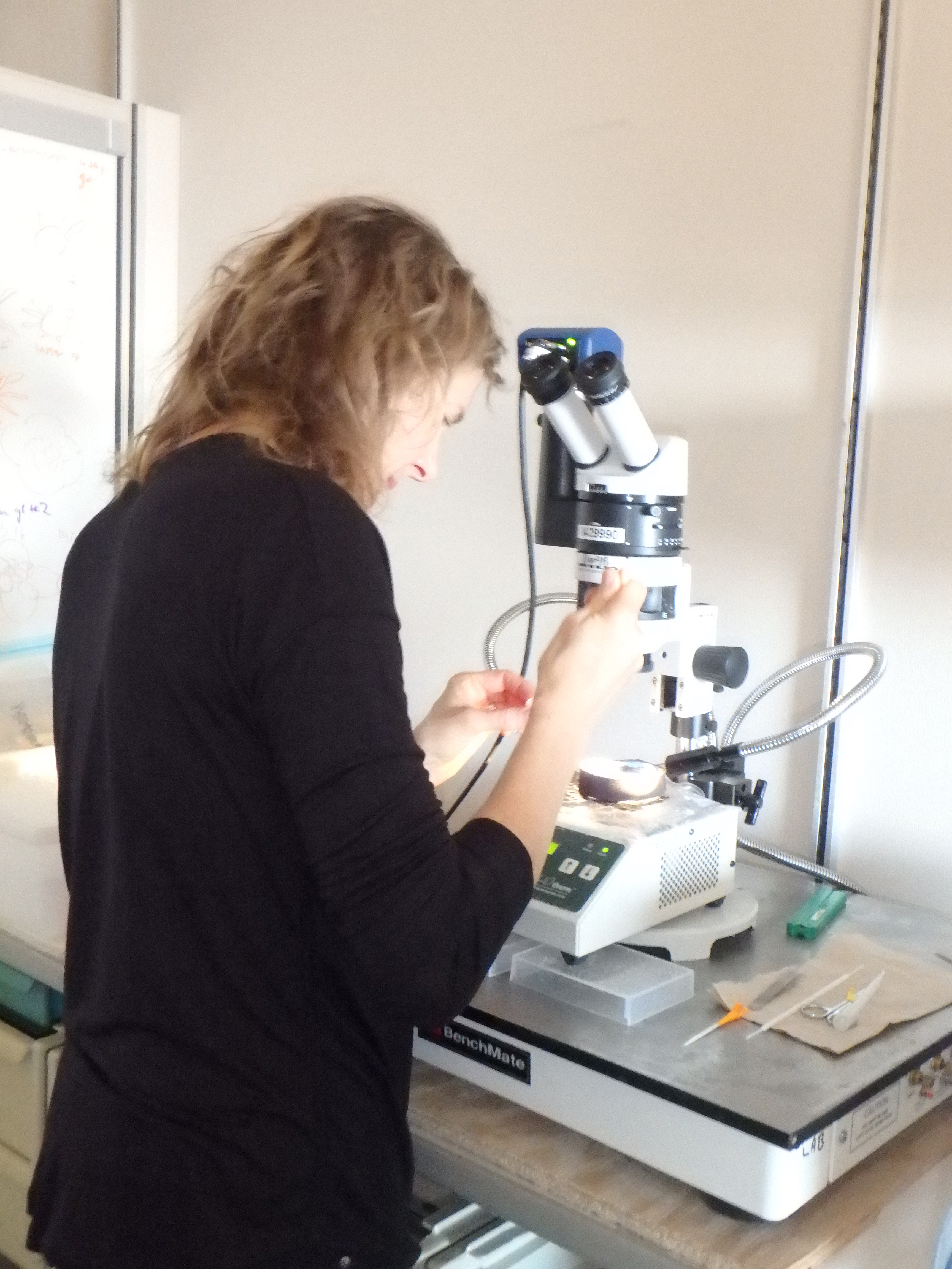 Dr. Amy Moran uses a microscope to conduct her research on the development of sea spiders and nudibranchs. Crary Lab, McMurdo Station, Antarctica.