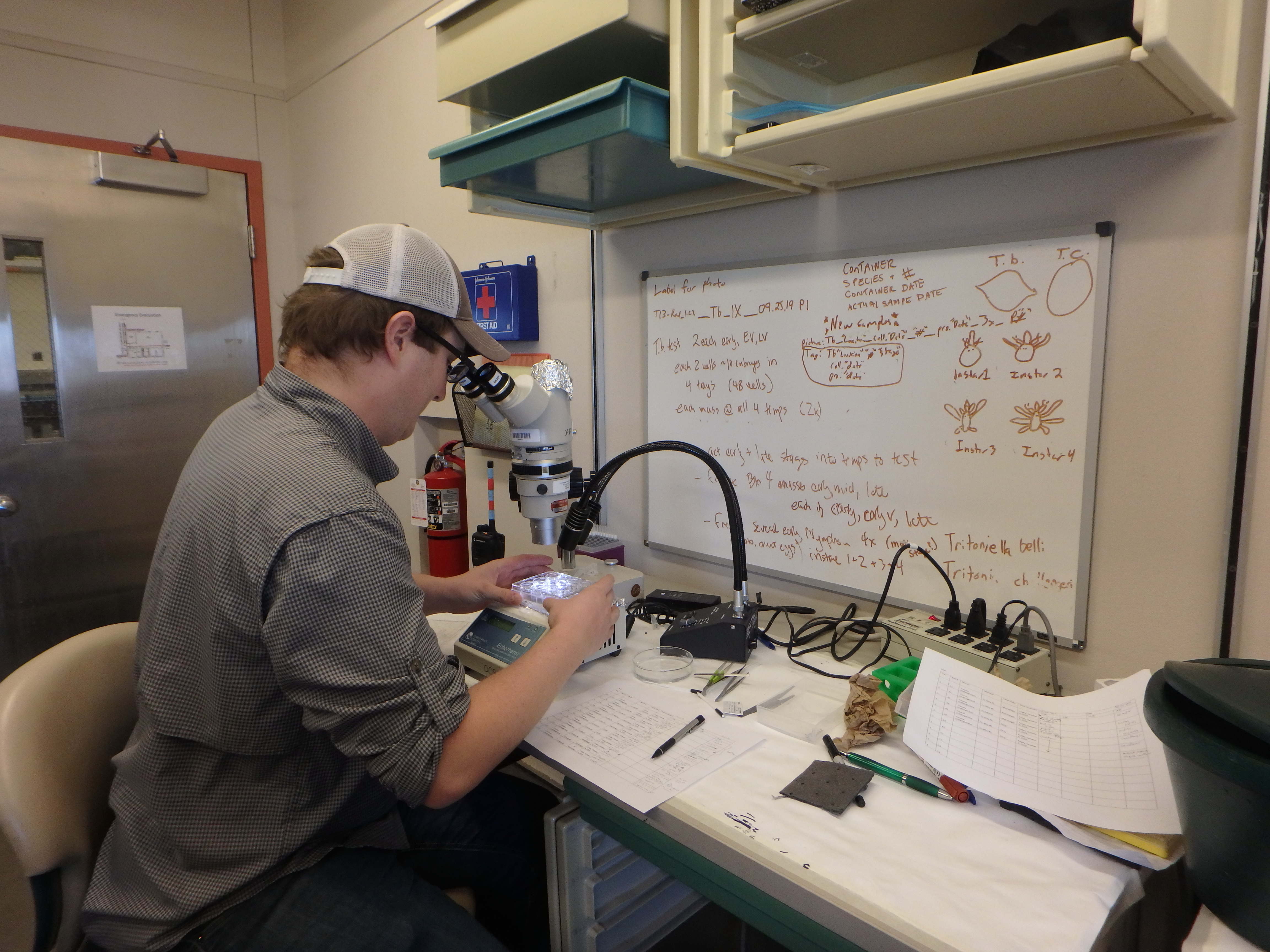 Graham Lobert looks through a microscope at eggs and larvae held in the wells of plastic trays. Crary Lab, McMurdo Station, Antarctica.