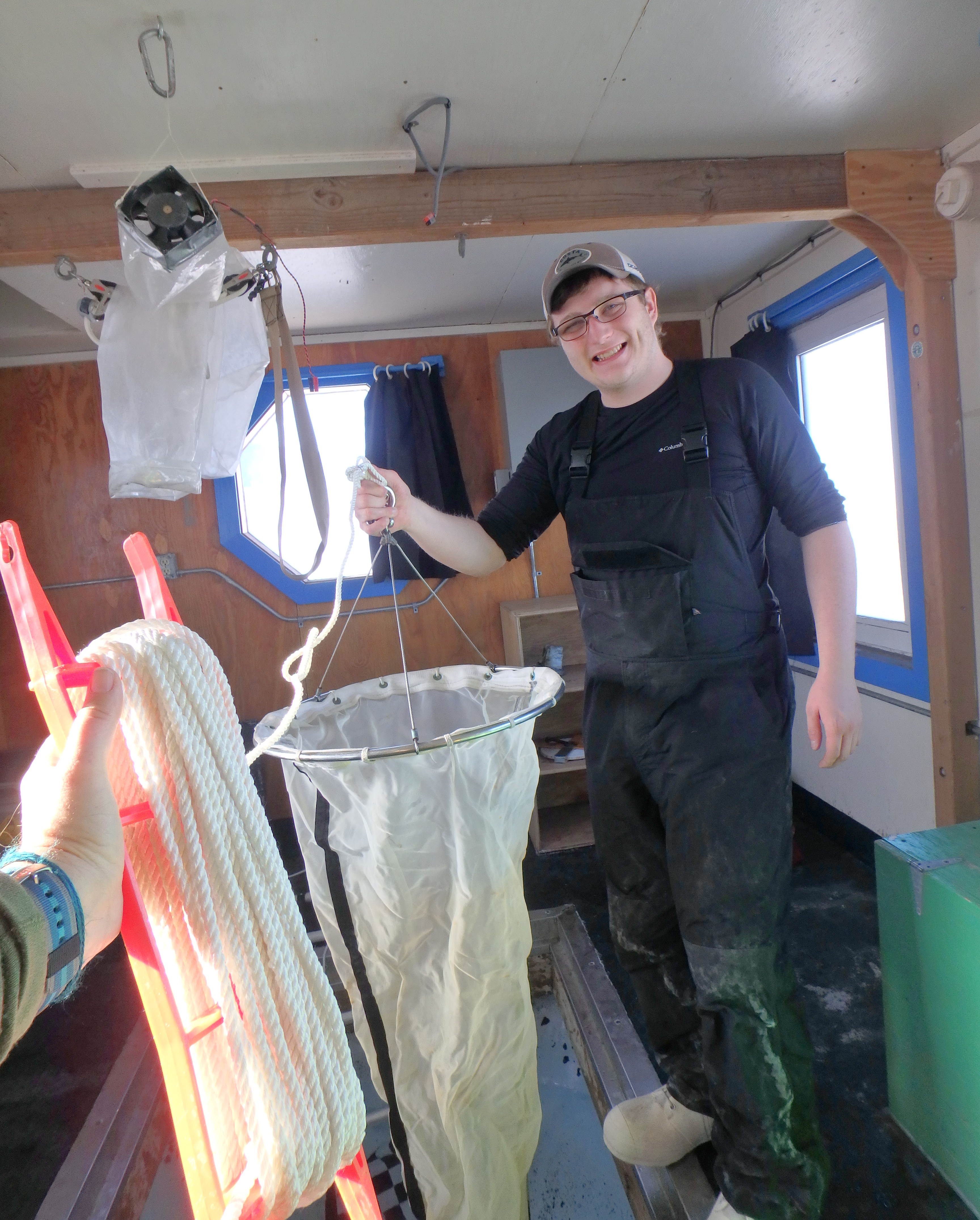 Graham Lobert holds a plankton tow net at the Jetty hut in McMurdo Sound, Antarctica.