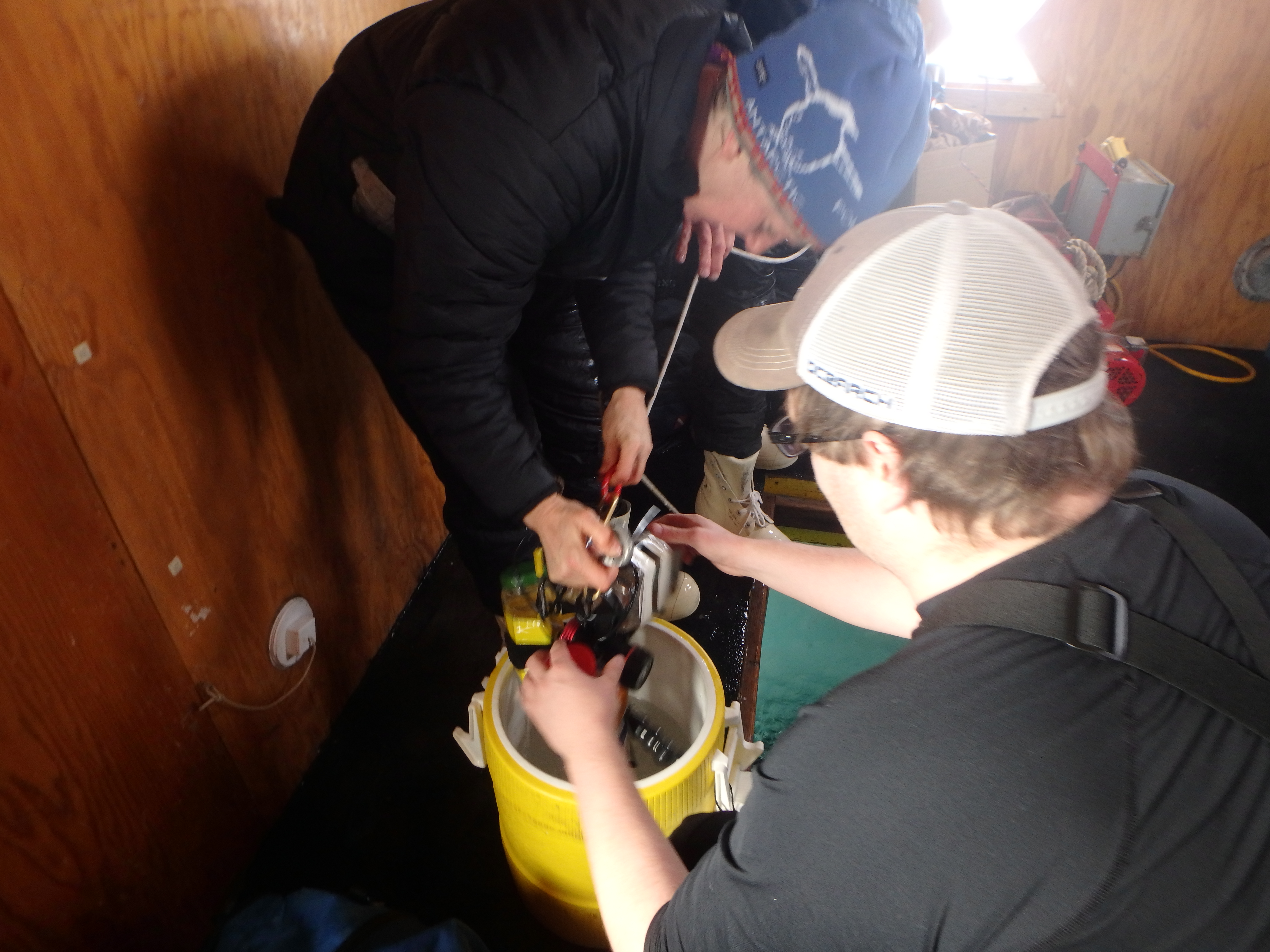 Dr. Amy Moran and Graham Lobert unhook the containers holding sea spiders and nudibranchs from the line. These animals will be transported back to the lab in the yellow cooler. Turtle Rock, McMurdo Sound, Antarctica.