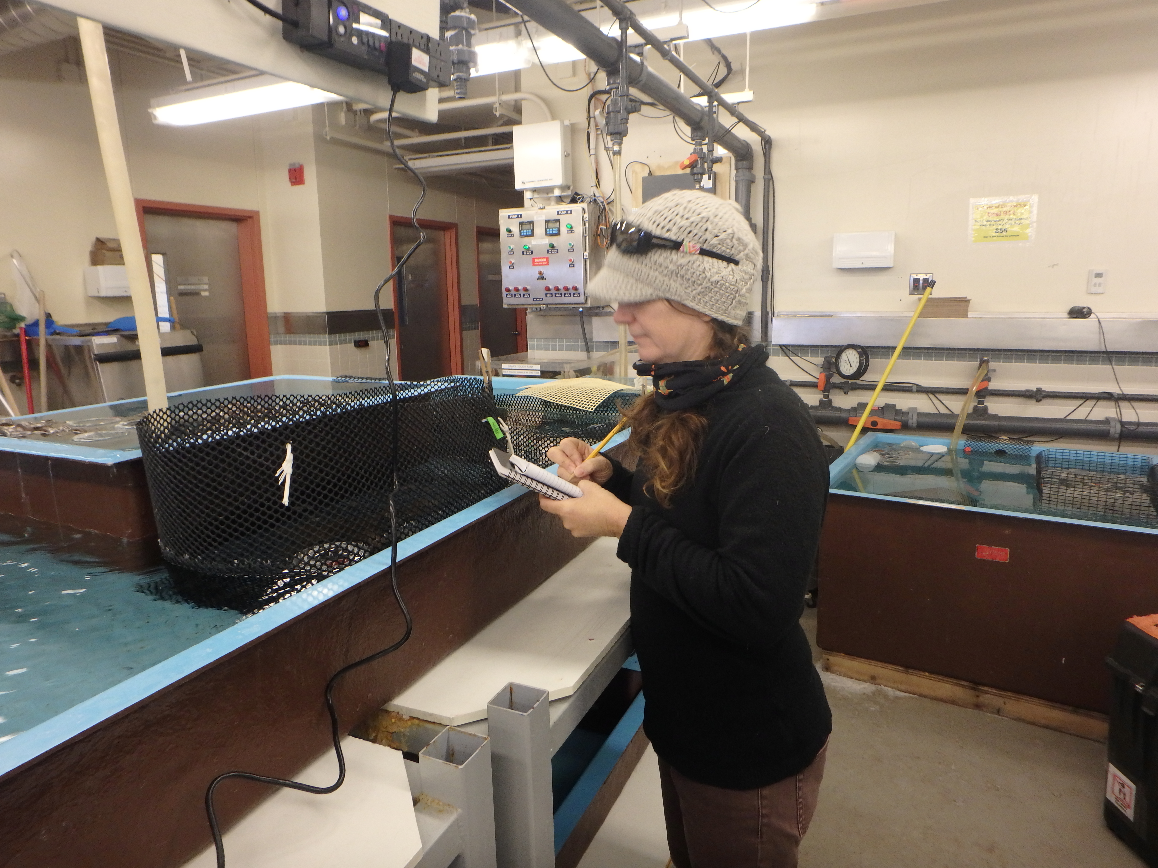 Amy Osborne makes observations and takes notes in the Crary Lab Aquarium, McMurdo Station, Antarctica.