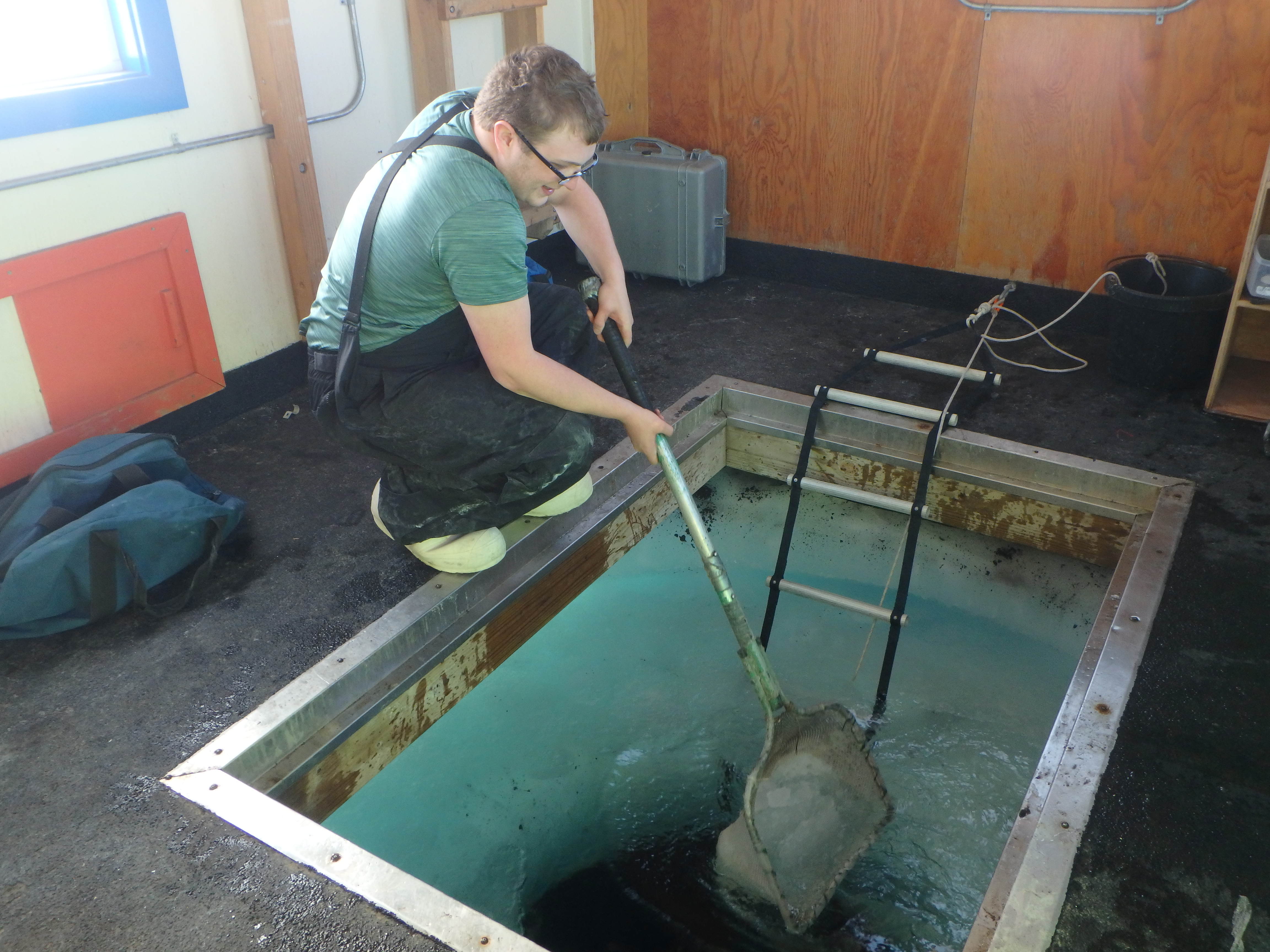 Graham Lobert uses a net to clear the ice out of a dive hole in the Jetty Hut. McMurdo Sound, Antarctica.