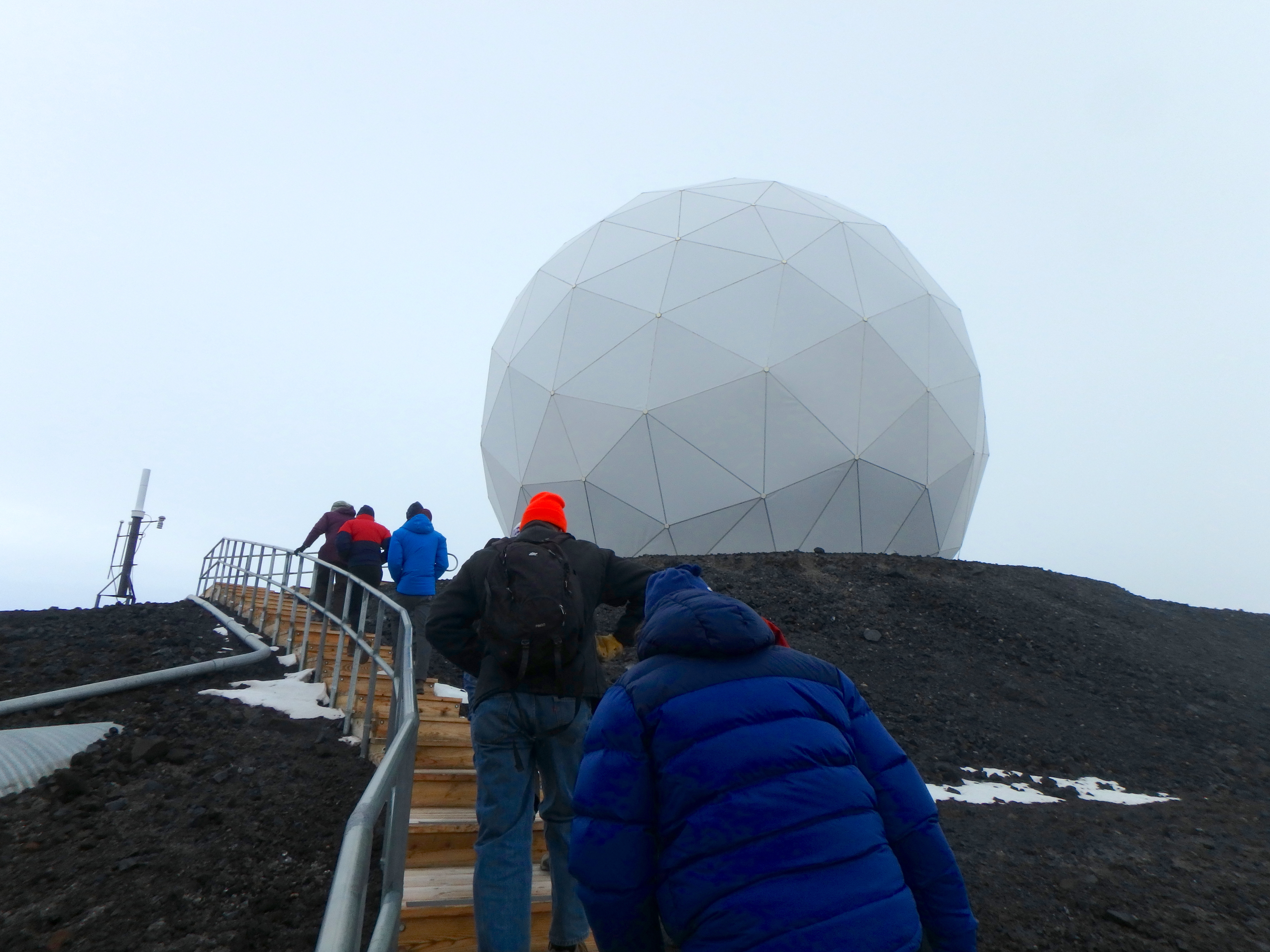 The team takes a field trip to the large geodesic dome that contains a satellite dish. McMurdo Station, Antarctica.