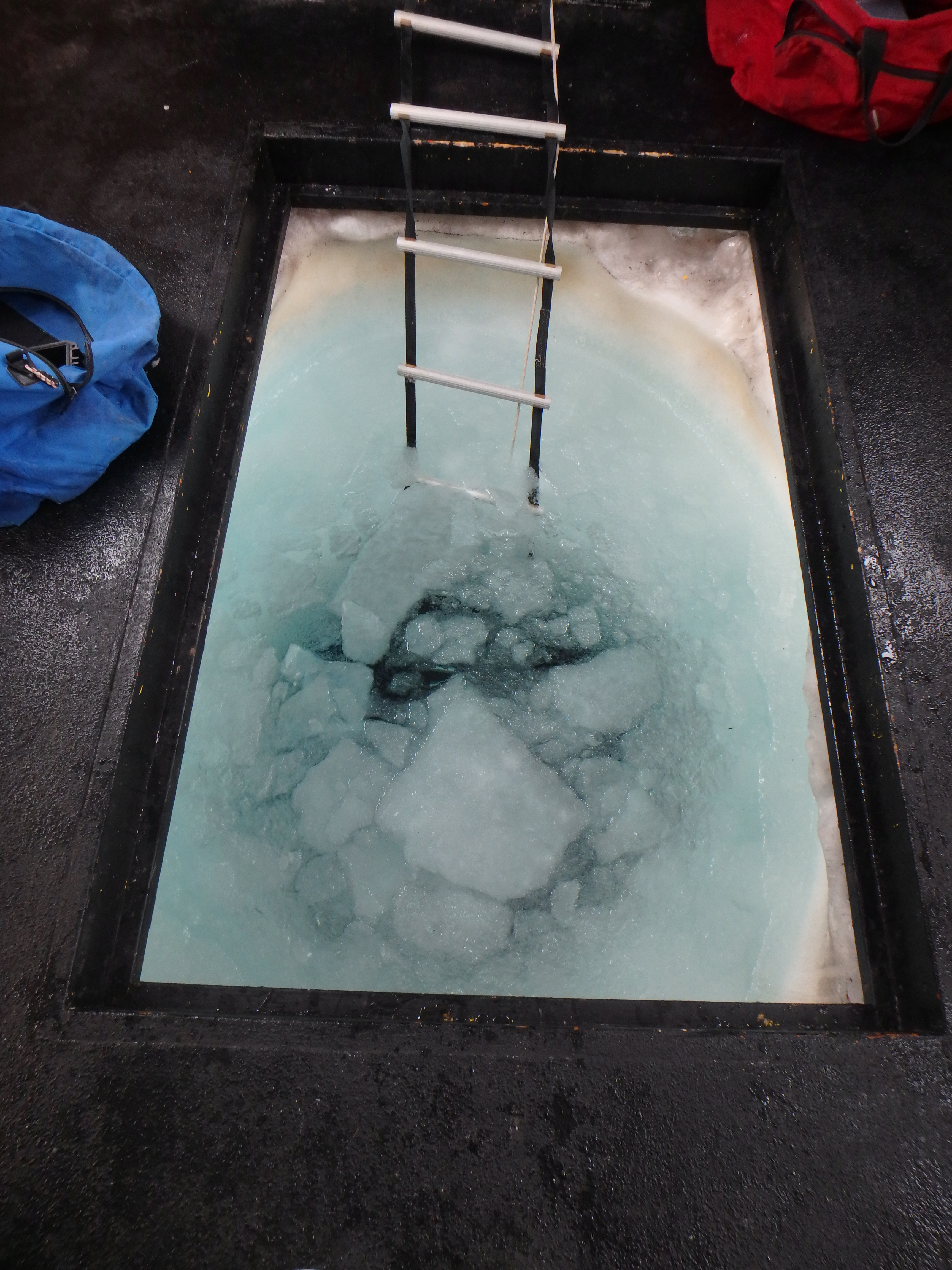 Ice clogs the dive hole inside the dive hut at Cape Evans, Antarctica.