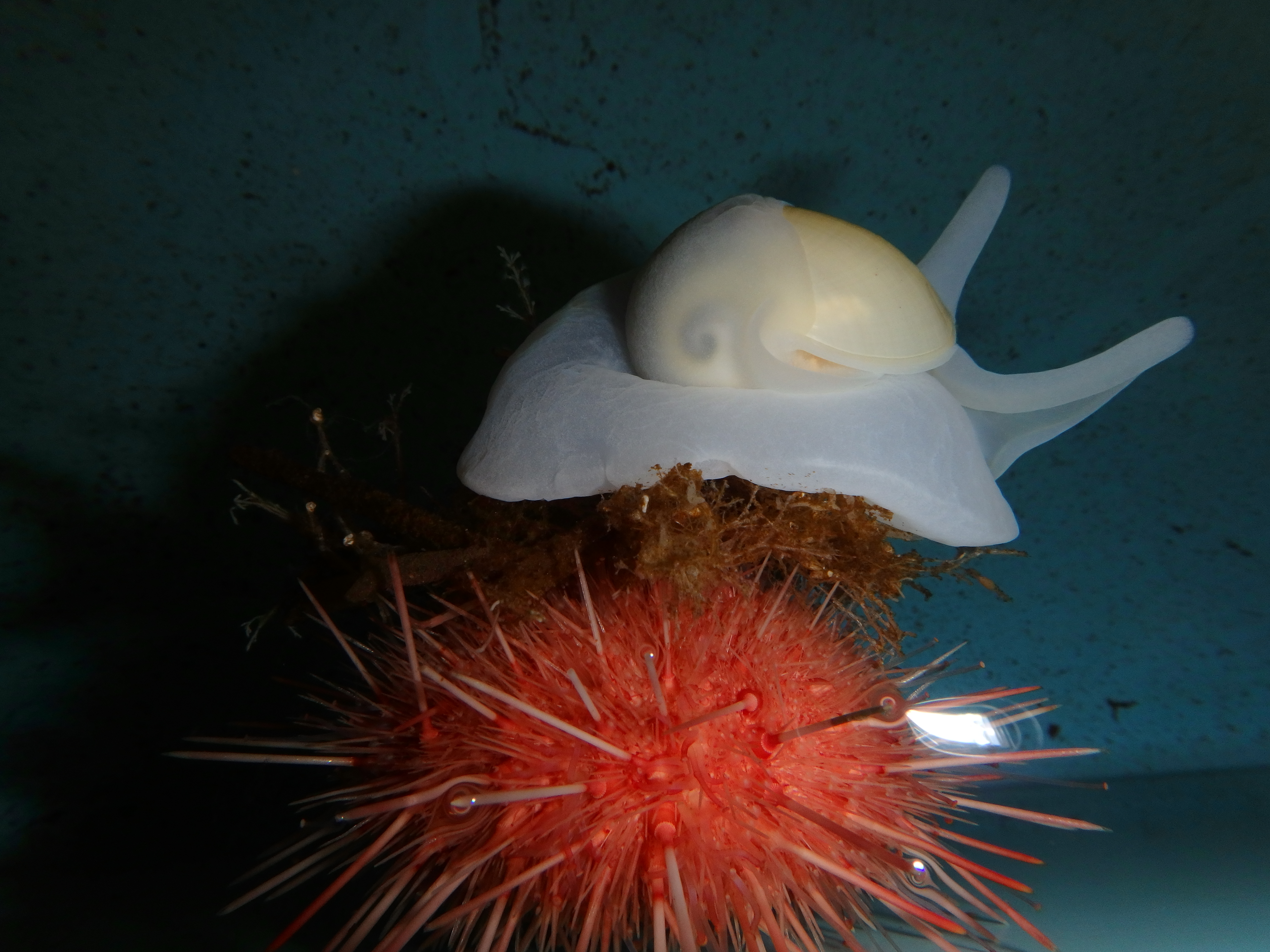 A snail crawls on top of a sea urchin in the Crary Lab Aquarium, McMurdo Station, Antarctica.