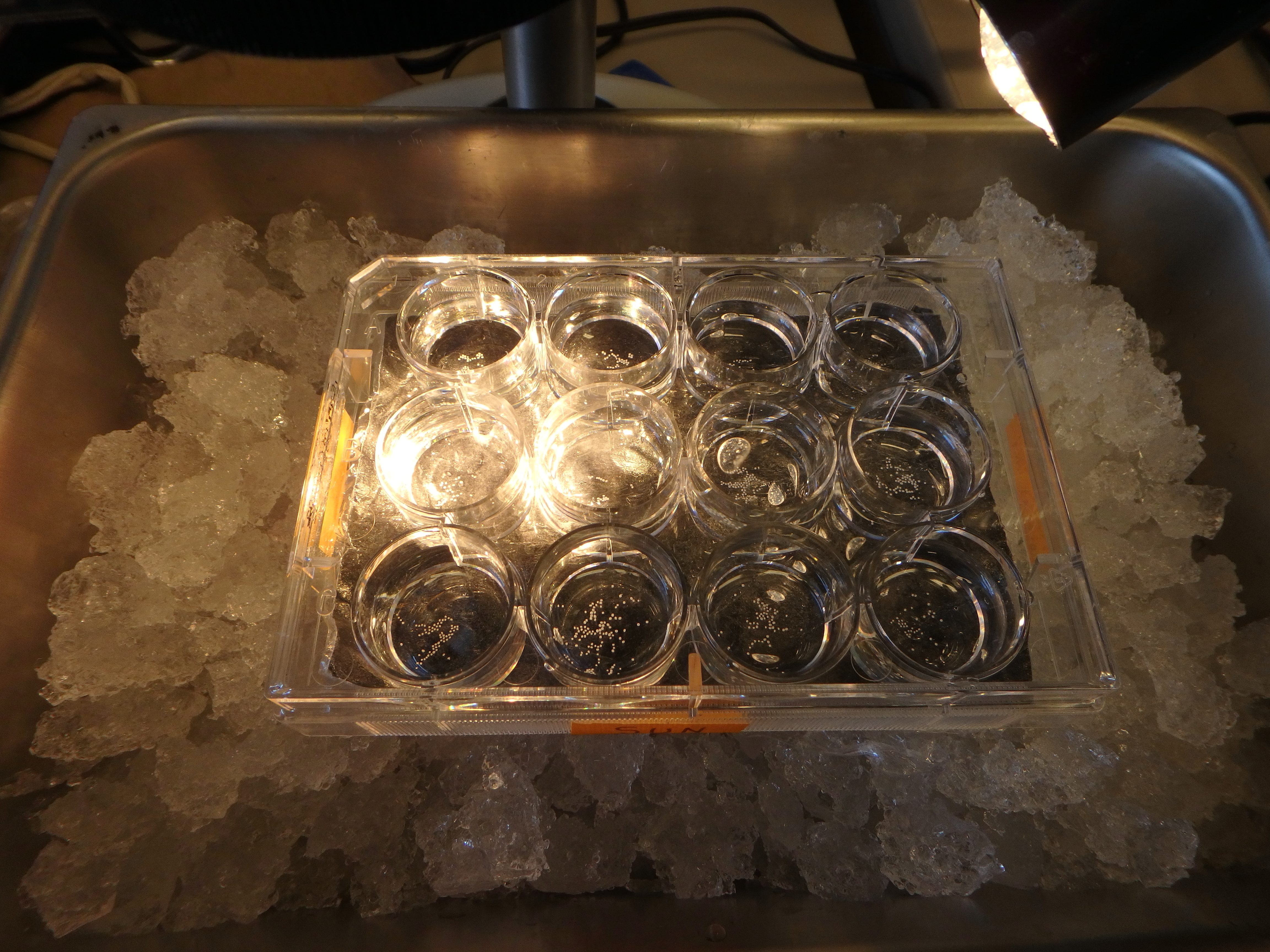 This tray has about 20 nudibranch eggs/larvae in each well. The microscope being used does not have a cold stage so the water is being kept cold by putting it on ice. Crary Lab, McMurdo Station, Antarctica.