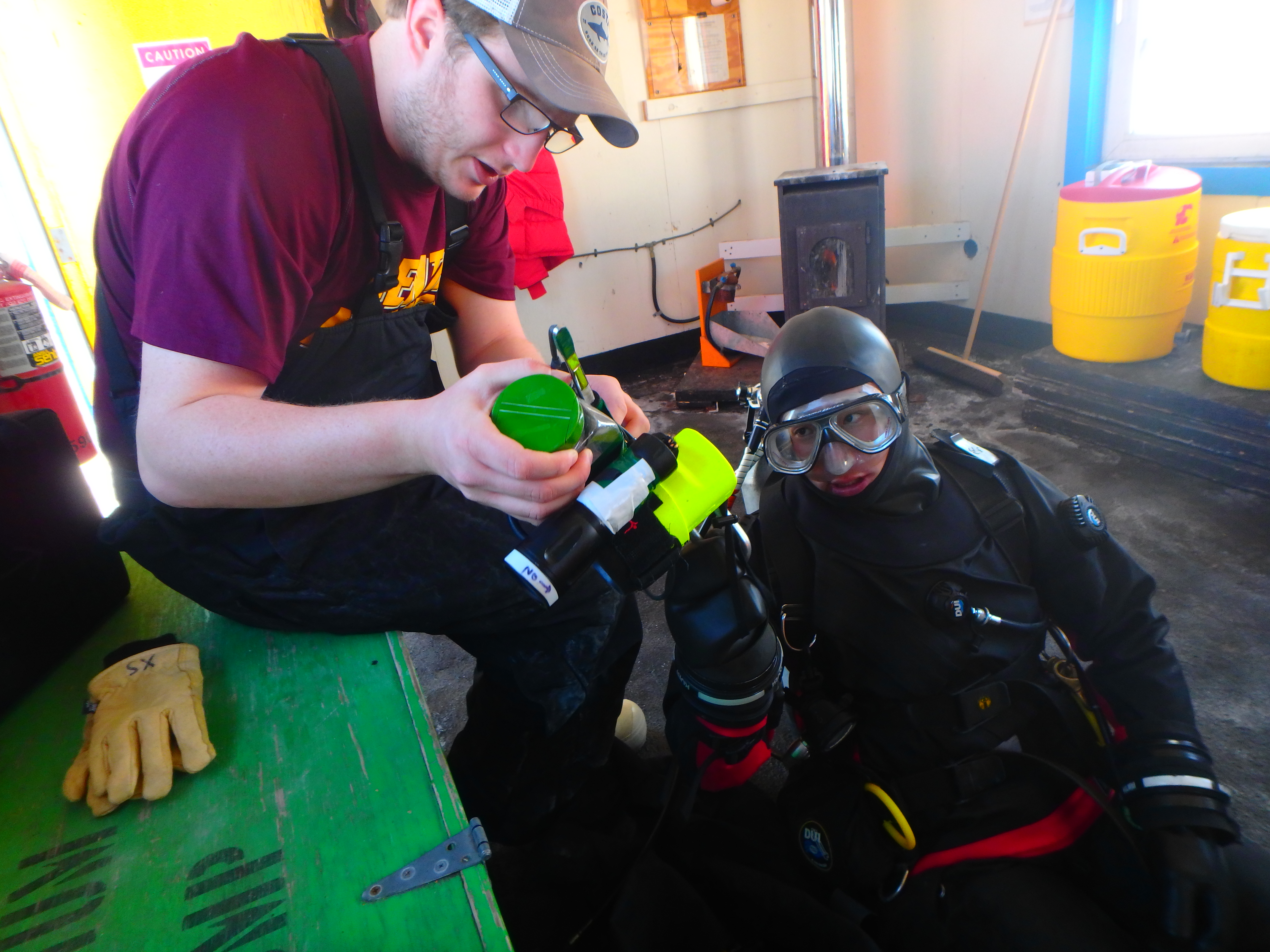 Graham Lobert helps Aaron Toh with his flashlight and collecting container in a dive hut on the Ross Sea, Antarctica.