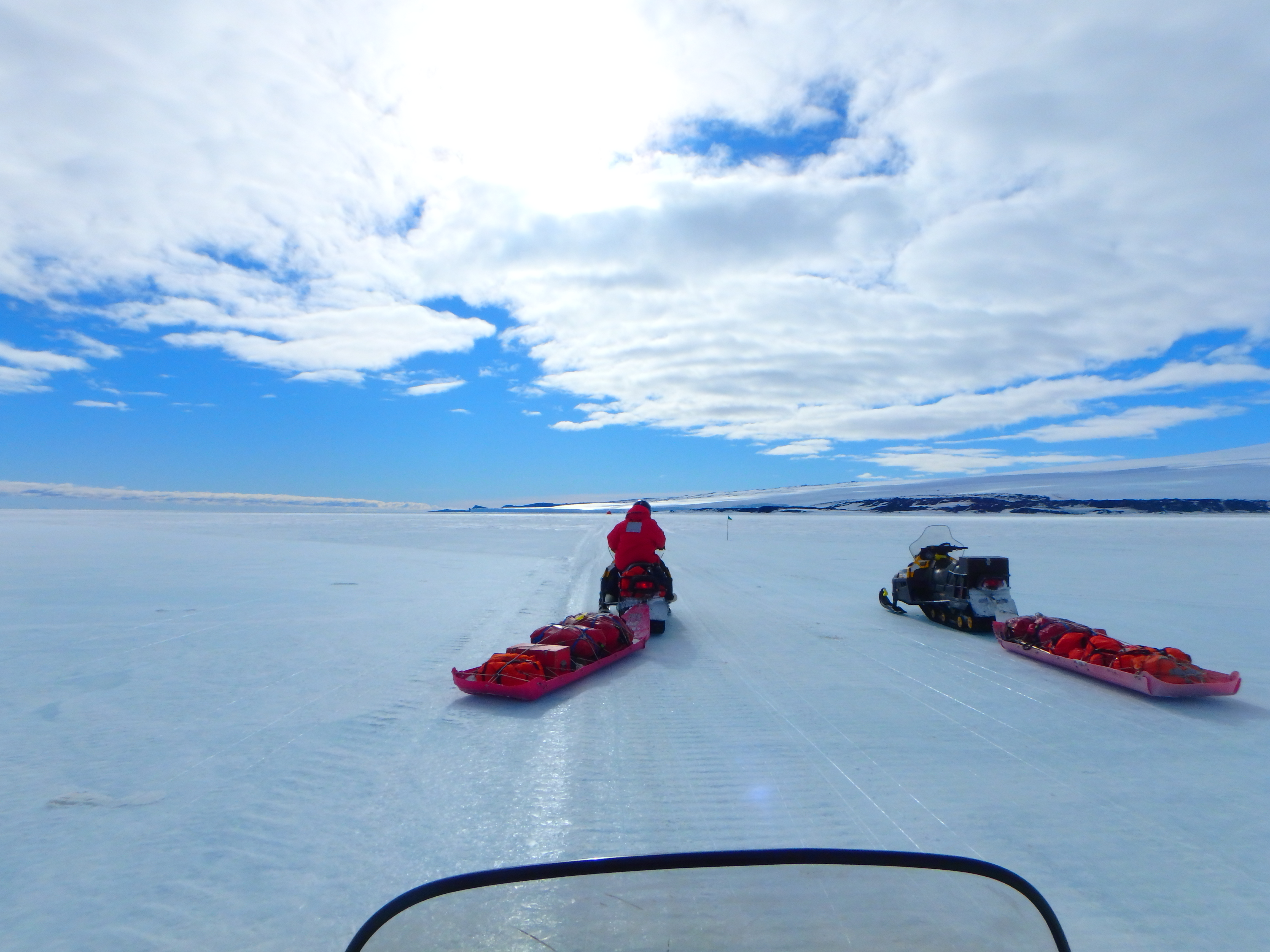 The team uses snowmobiles to tow sleds with survival bags and extra Extreme Cold Weather gear. The team carries these things whenever they go out on the sea ice. Ross Sea, Antarctica.