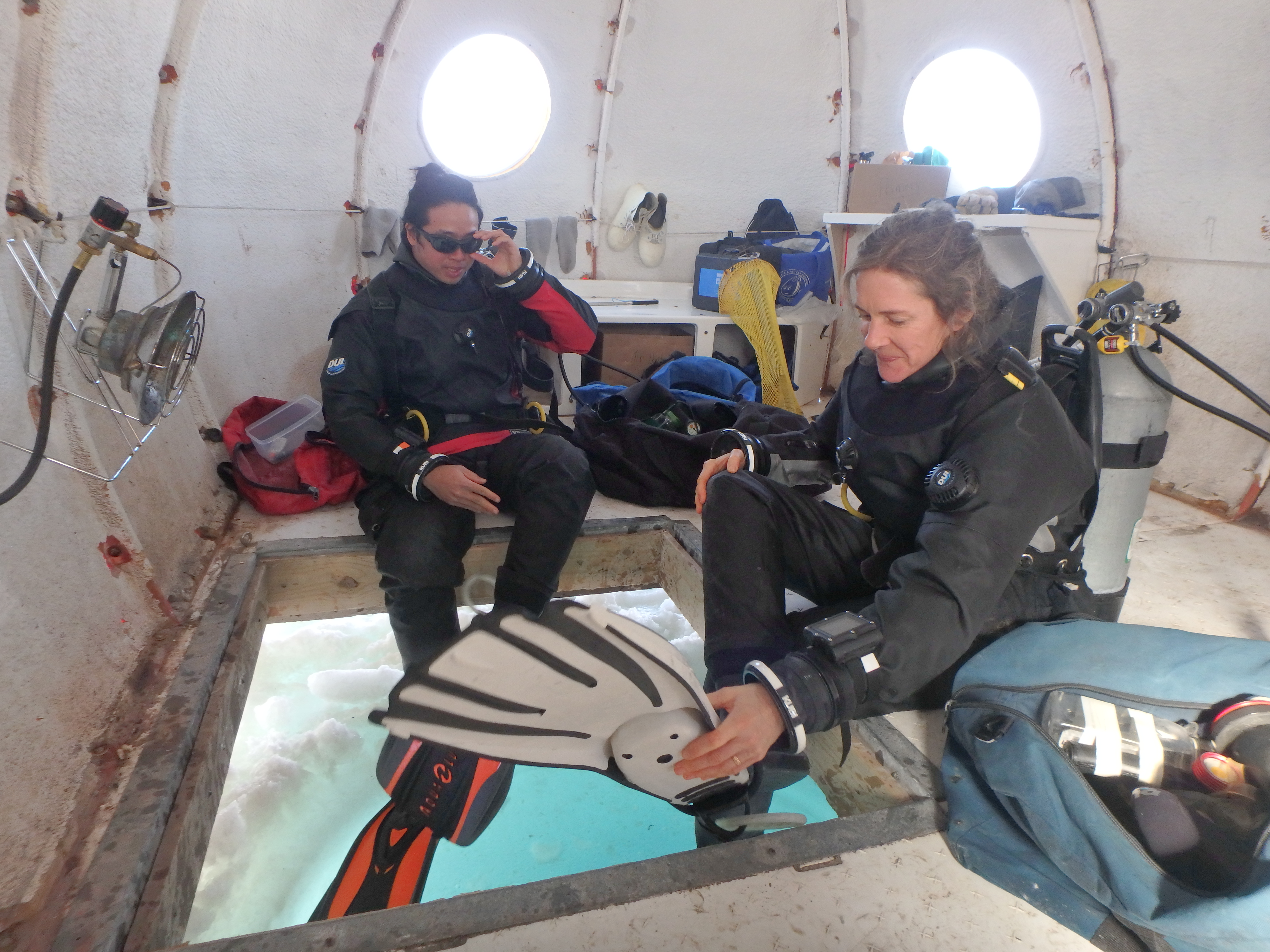 Science divers and researchers Aaron Toh and Dr. Amy Moran prepare to dive into McMurdo Sound, Antarctica. They are in search of sea spiders and nudibranchs.